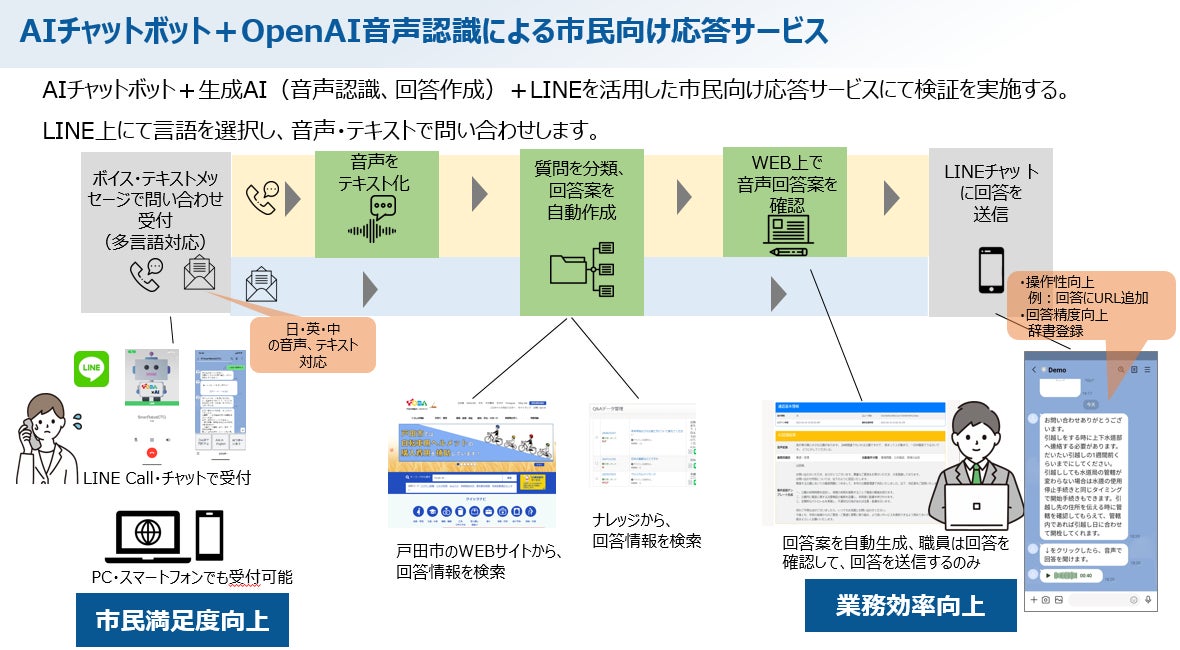 これは、生成AIを活用し「AIチャットボット」と「OpenAI音声認識」を組み合わせた新たな市民向け応答サービスを構築することにより、市民からの問い合わせ対応のスピードアップとサービスの向上、そして行政側の業務効率化を目指すものです。