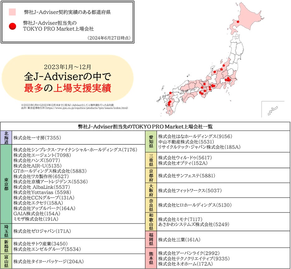 日本M&Aセンターでは、企業成長のさらなる促進・円滑な事業承継・一般市場への上場に向けた体制整備を目的にTOKYO PRO Marketへの上場支援に取り組んでおり、既存上場企業含め全国で100社以上のJ-Adviser契約実績があります。