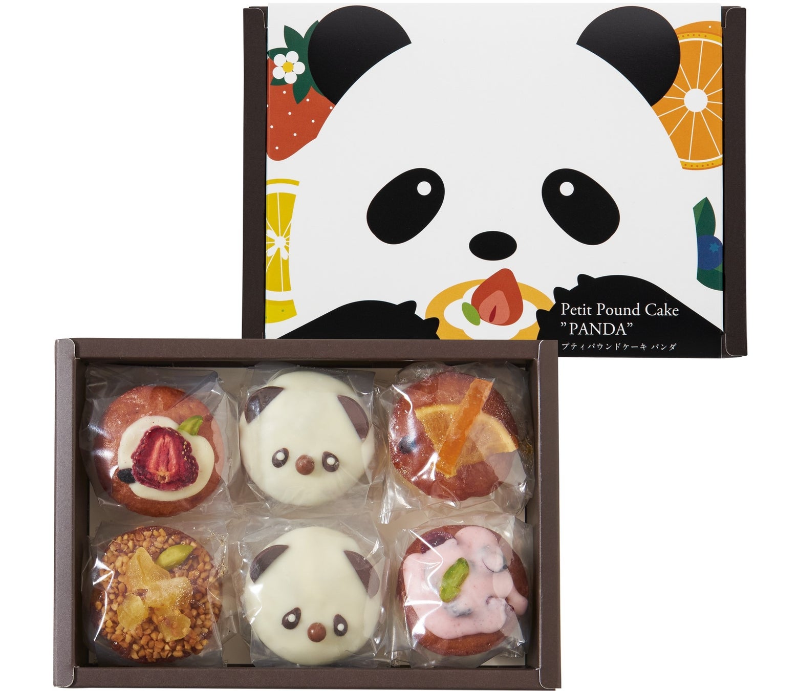 上質なチョコレートを使用した可愛らしいパンダのパウンドケーキ2個と、フルーツケーキ4種類を詰め合せました。