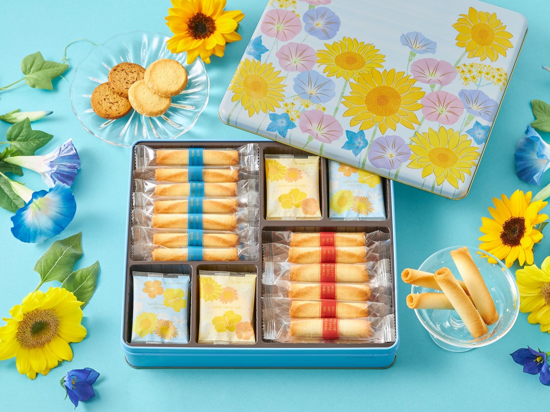 「夏の贈り物」にありがとう、おめでとう、たくさんの想いを込めて素敵な花言葉を持つ夏のお花のデザインパッケージでご用意いたしました。プティサイズのシガール2種と夏限定のレモンとオレンジを使用した夏らしいサブレのお詰め合わせです。
