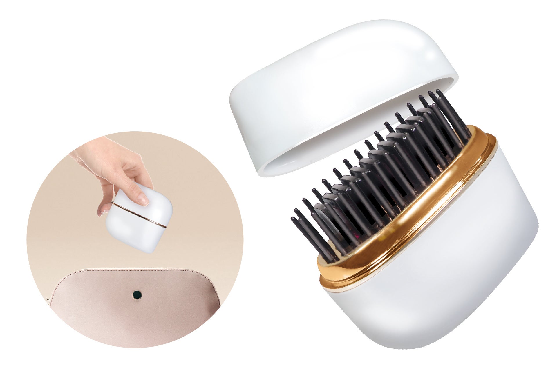特徴:手軽に使えるストレートヘアアイロン!USB充電式のコードレスで持ち運び便利、前髪や毛先、細かい部分のお直しにぴったり。3段階温度調整で髪質に合わせて使え、忙しい朝も時短スタイリング◎ホワイト×ゴールドの上品デザインで見た目もかわいい♪コンパクト設計、ブラシ一体型、やけどしにくい構造で安心!お出かけ先や旅行先でもサッとキレイに整う♪