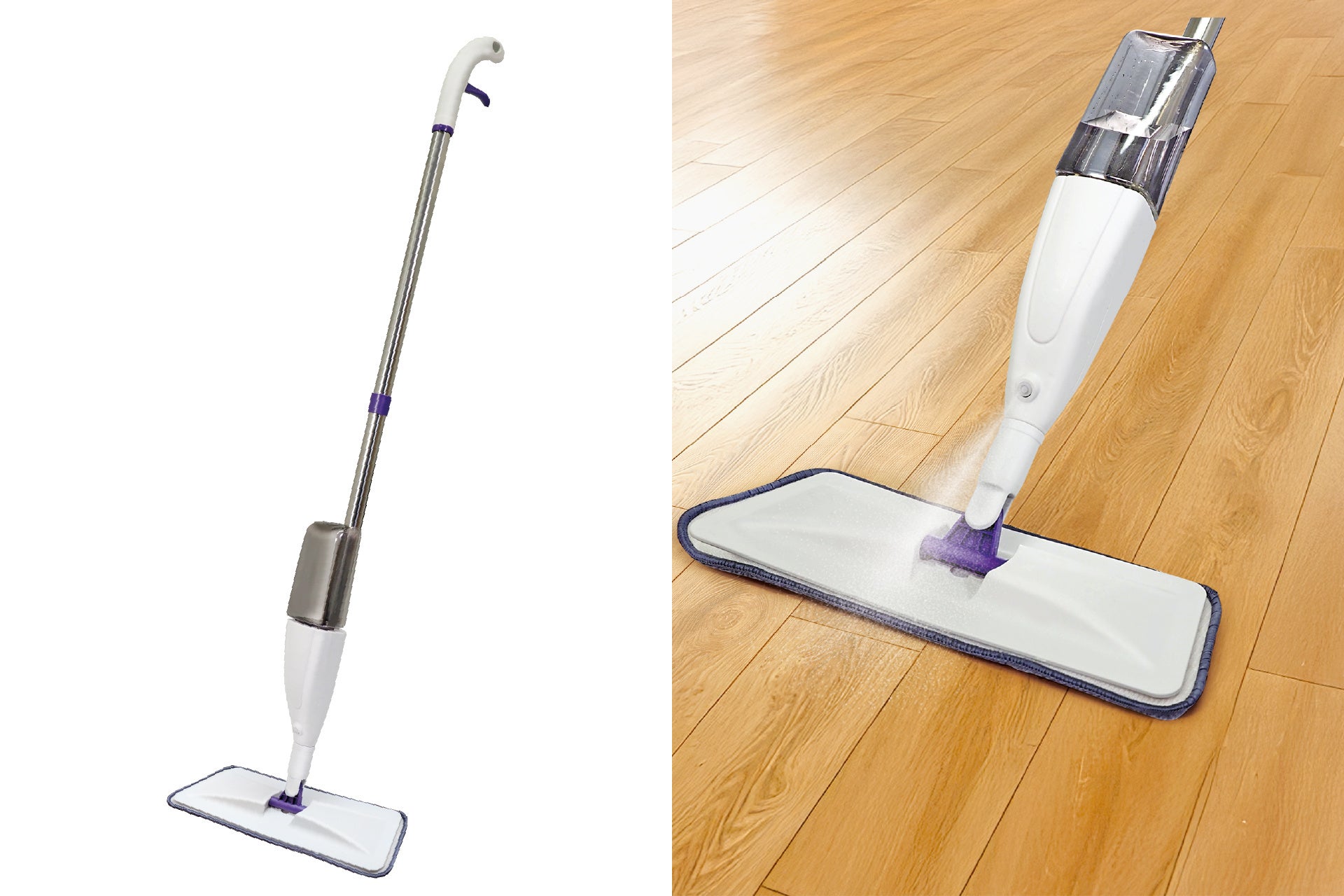 特徴:レバーを握るとミスト状の水がシュッとひと吹き、立ったまま水拭き掃除!乾湿両用のマイクロファイバースプレーモップ!マイクロファイバー素材の高い吸水力と、便利なスプレー機能で、毎日の床掃除をもっと手軽に。