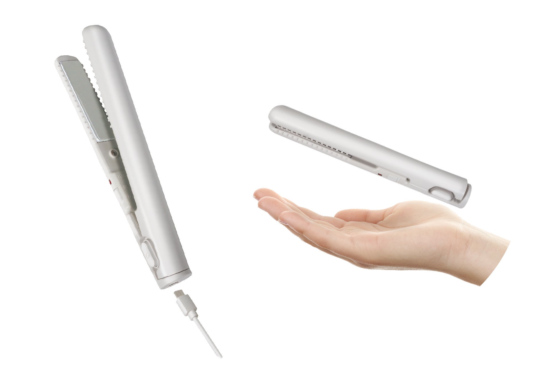 特徴:持ち運びラクラク♪どこでもサッとスタイリングできるスリムヘアアイロン!USB給電式で外出先や旅行にも便利、前髪や毛先のアレンジにぴったりのコンパクトサイズ。180℃のしっかり温度でクセをキレイに整え、忙しい朝も時短に◎シンプルで清潔感のある「ホワイト」カラーも魅力。軽量設計、ロックボタン付き、モバイルバッテリー対応で使い勝手抜群!通勤やお出かけ先でもサッとお直し♪