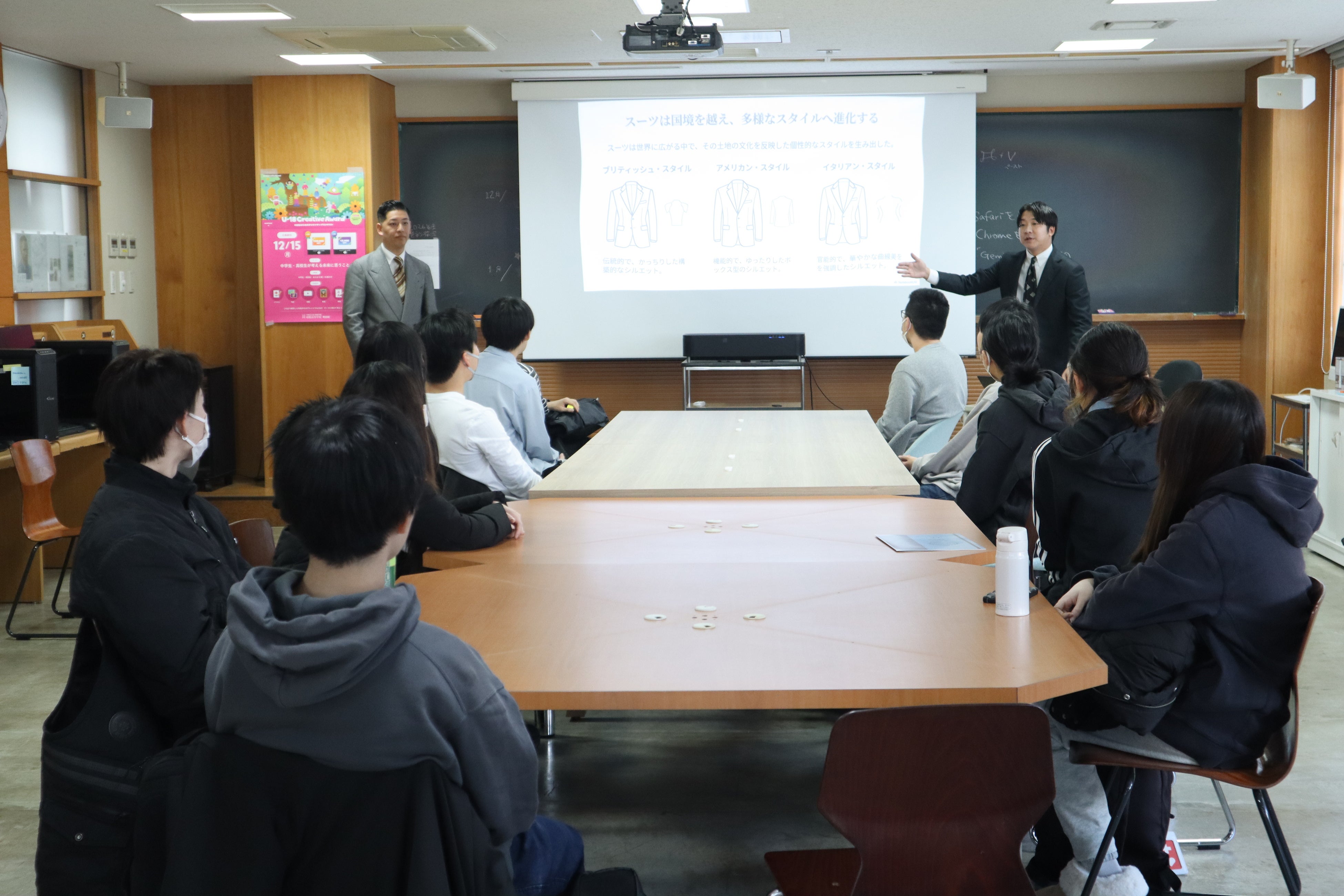 「オーダースーツ制服」の取り組みは、「松陰高等学校 町田校」の授業内で、高校1年生~3年生の12名を対象に実施しました。「装うことの大切さ」を学べる機会の提供として、スーツスクエアのスタッフによる「着こなし・マナー講座」も開催。ジャケットのボタンの留め方やサイズ感の重要性の他、スーツの変遷と歴史の関係性なども紹介しました。一連の流れを通して、社会に出るための準備や装うことの大切さ・楽しさを学べる内容となっています。