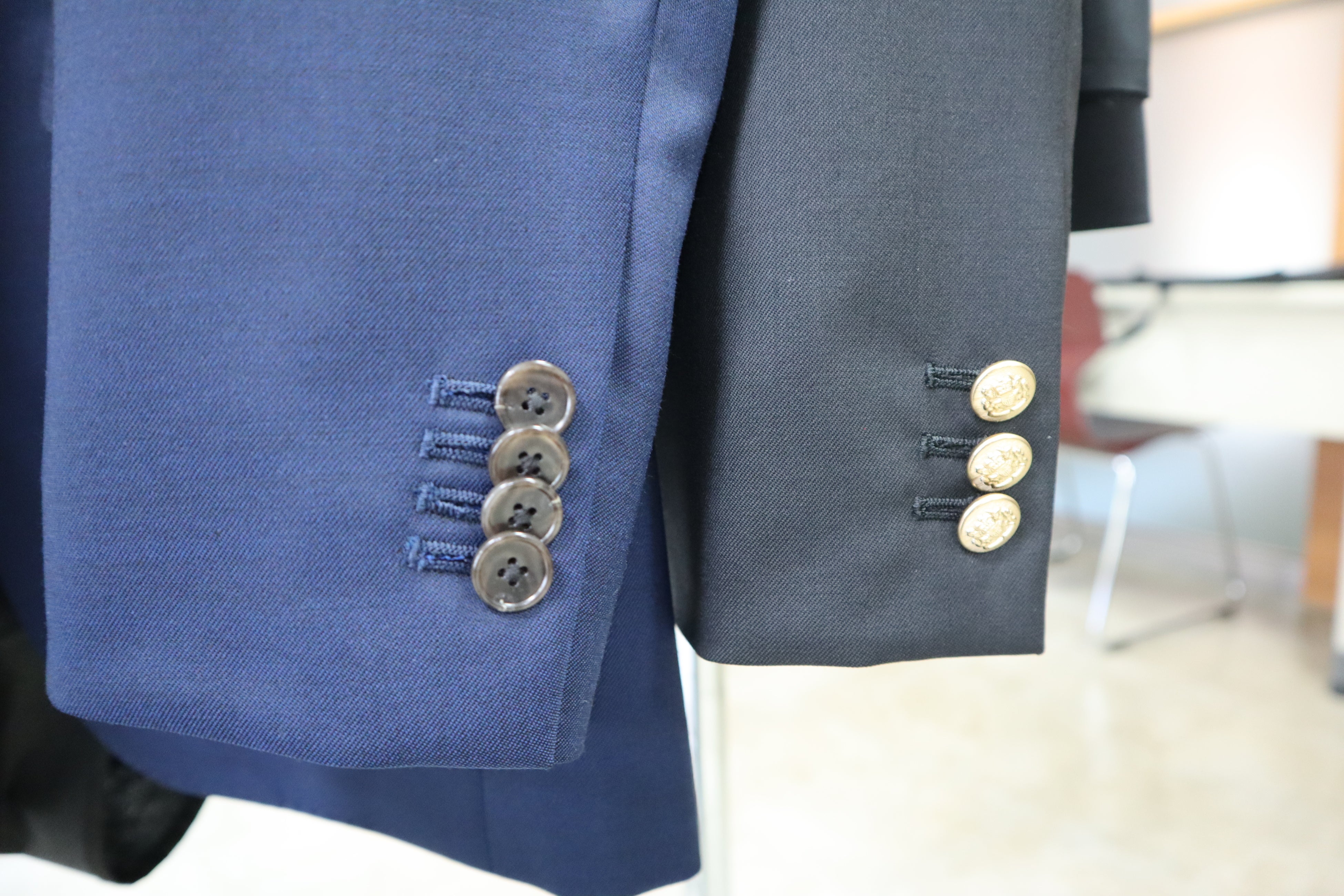 「着こなし・マナー講座」後は、好みの生地やデザイン、裏地やボタンを選ぶ工程へ移行。生徒の皆さまはサンプルの生地にボタンや裏地を合わせながら、完成後のイメージを膨らませていました。その後、生地が決まった方から採寸に移り、サンプルとなるゲージ服を着用。高校生のため、これからの成長を見越したサイズ調整を行いました。