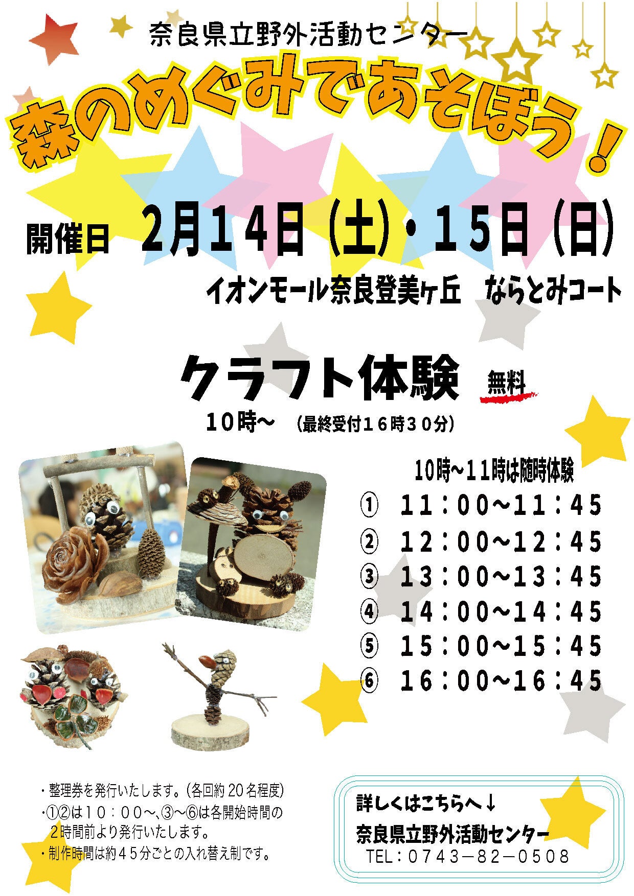 2月14日(土)・15日(日)にイオンモール奈良登美ヶ丘にてネイチャークラフト体験の無料イベントを開催します!【奈良県立野外活動センター】森のめぐみで遊ぼう! イオンモール奈良登美ヶ丘奈良県2026年1月29日 10時19分いいね!数を読み込み中です木の実や木の枝などを使ってネイチャークラフト体験(無料)を行います。 日時:2月14日(土)・15日(日) 10時 ~ 17時 場所:イオンモール奈良登美ヶ丘 3Fならとみコート 詳しくはこちらから すべての画像種類イベントビジネスカテゴリその他キーワードクラフト体験家族でおでかけイベントイオンモール奈良登美ヶ丘位置情報奈良県奈良市(公共施設・公共交通機関)関連リンクhttps://www.pref.nara.jp/31607.htmダウンロードプレスリリース素材このプレスリリース内で使われている画像ファイルがダウンロードできます