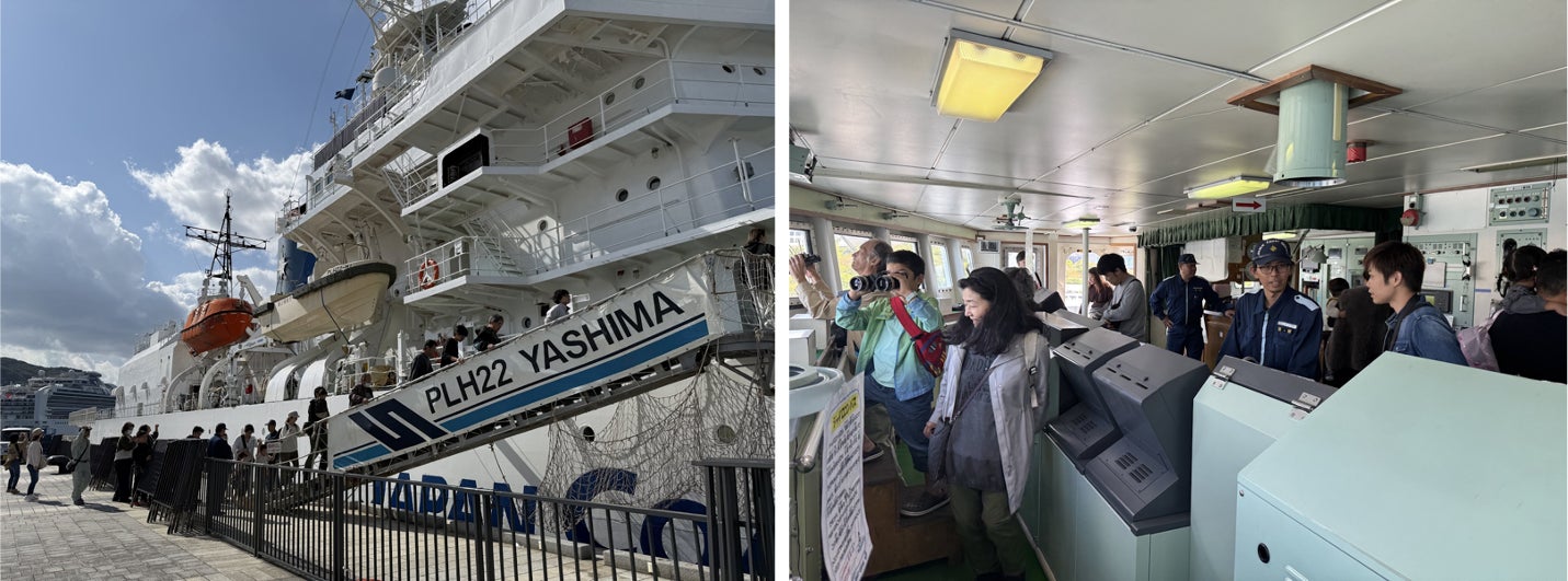 ■1日(土)限定で、海上保安庁の巡視船「やしま」の特別一般公開見学が行われました。全長130mの巨大な船内を見学した子どもたちは「海上保安庁ってこんな仕事をしているんだ」と目を輝かせ、来場者は、海の安全を守る仕事への理解と敬意を深めていました。