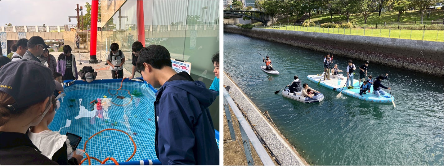 また、巨大SUP(スタンドアップパドル)体験、高校生が製作した電動船の操作体験、そして海洋ごみを使ったキーホルダー作りワークショップも実施されていて、子どもも大人も夢中でチャレンジしていました。この日は、夕方まで水辺の森公園側でも Lovefesのステージイベントや花火が控えていたため、イベントの賑わいが終了時間まで続きました。