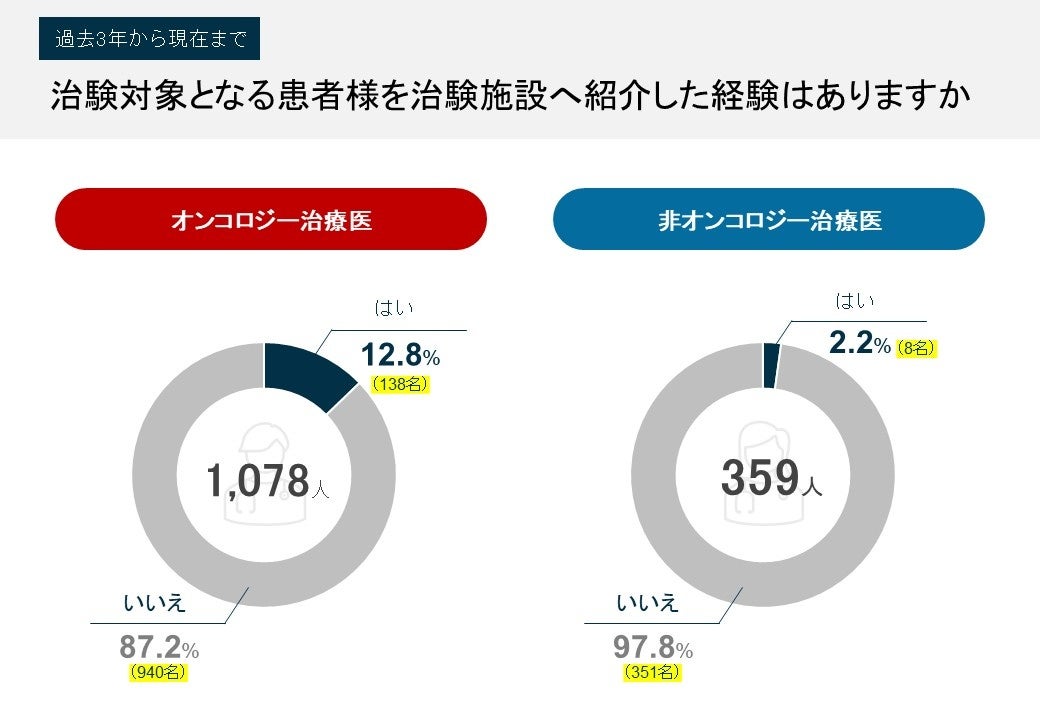 治験実施医療機関への患者紹介の実態:過去3年間で治験対象となる患者様を他科や治験施設へ「紹介した経験がある」と回答した医師は、オンコロジー治療医で12.8%(138名)にとどまり、非オンコロジー治療医では2.2%(8名)とさらに低い結果でした。