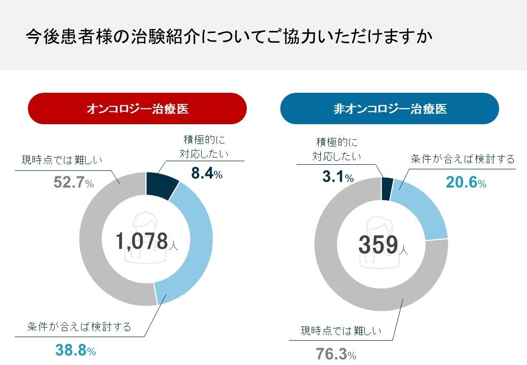 株式会社QLife(キューライフ/代表取締役:可知 健太、本社:東京都港区)は、治験に対するイメージや課題を把握し今後の治験啓発に生かすことを目的とした、特定の診療科に所属している医師を対象のWEBアンケートを実施し、1,437名(うち、オンコロジー治療を行っている医師(以下、オンコロジー治療医)1,078名、オンコロジー治療を行っていない医師(以下、非オンコロジー治療医)359名)から回答を得ました。
