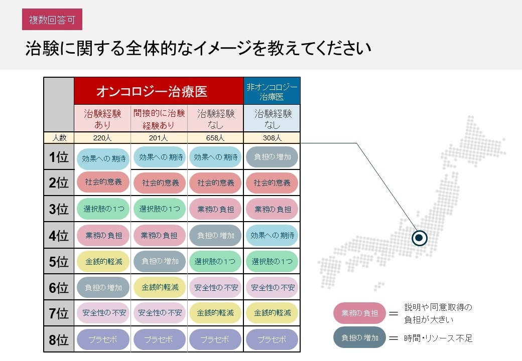 治験関与の有無によるイメージの違い:オンコロジー治療を行う医師のうち、治験責任医師・治験分担医師の経験あり(220人)や、所属の診療科での参加や紹介などで間接的に治験経験あり(201人)の層では、「効果への期待」「社会的意義」「治療選択肢の1つ」といった前向きなイメージが上位を占めました 。一方、治験経験なしの層では、「説明や同意取得業務の負担」や「時間・リソース不足」といったイメージが上位に挙がり、治験が治療の選択肢の1つというイメージも低い傾向にあることが分かりました。