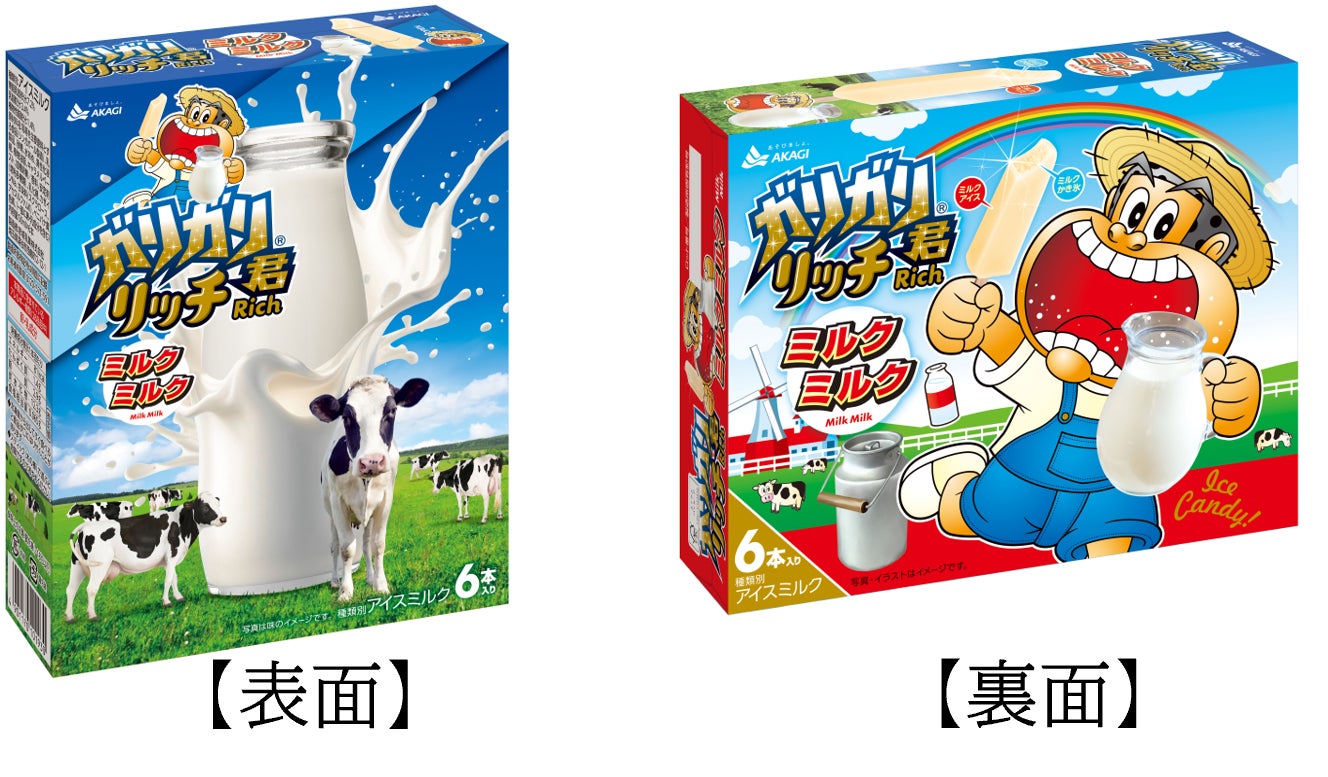 今回は「食欲の秋」をテーマに、パッケージの片面はそれぞれの味を美味しそうに感じ食欲をそそる表現として、「大人なガリガリ君いちご」は真っ赤に実った苺をぎっしり詰め込み、「ガリガリ君リッチミルクミルク」は牧場の風景を背景に瓶からミルクが溢れ出るデザインを採用しました。