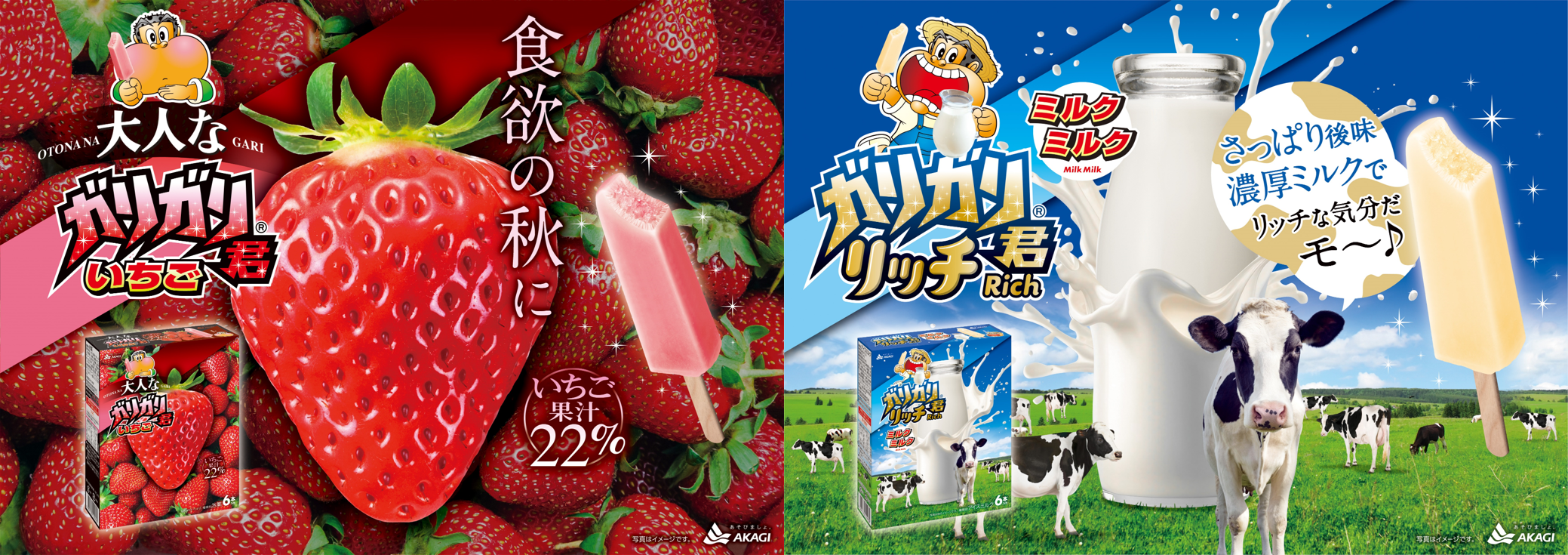 「食欲の秋」パッケージでガリガリ君が登場!! ぎっしり苺を詰め込んだデザインと、牧場で溢れ出るミルクのデザイン! 秋に向けた、濃い味と爽やかな後味が楽しめるガリガリ君です。