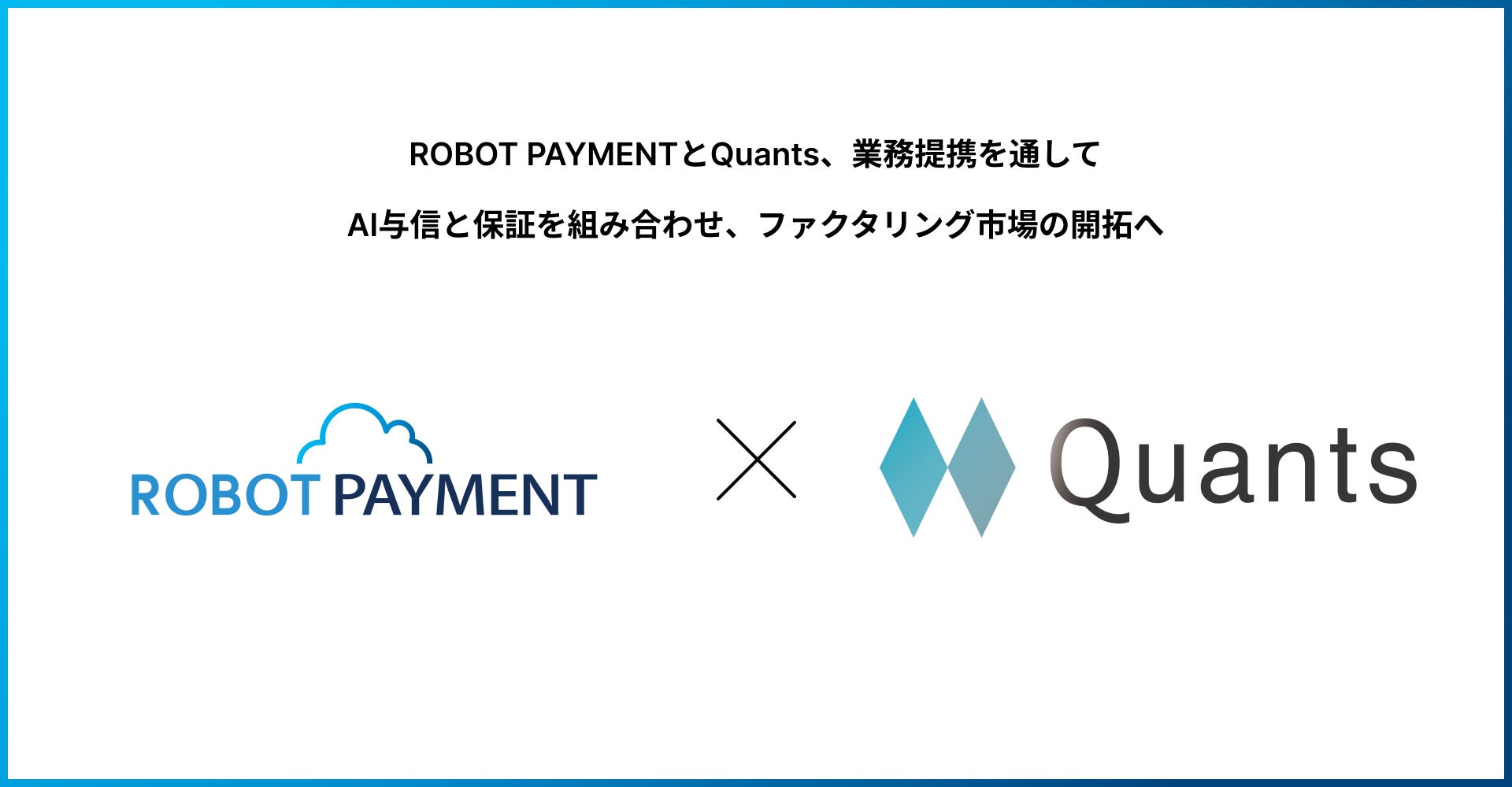 株式会社ROBOT PAYMENT(本社:東京都渋谷区、代表取締役:清久 健也、証券コード:4374、以下「当社」)は、AI与信審査技術の開発と提供および同技術を用いたFintechサービスの提供を行うQuants株式会社(本社:東京都港区、代表取締役社長:東小薗光輝、以下「Quants社」)と事業提携を行い、当社の提供するファクタリングサービスにおける貸し倒れ保険を締結しました。本提携を通じて貸し倒れリスクを低減し、与信審査の精度向上とともに、ファクタリングサービスの与信対象企業拡大を通して、業界や企業規模によりサービス提供できなかった新たな顧客層へのサービス提供範囲を拡大します。
