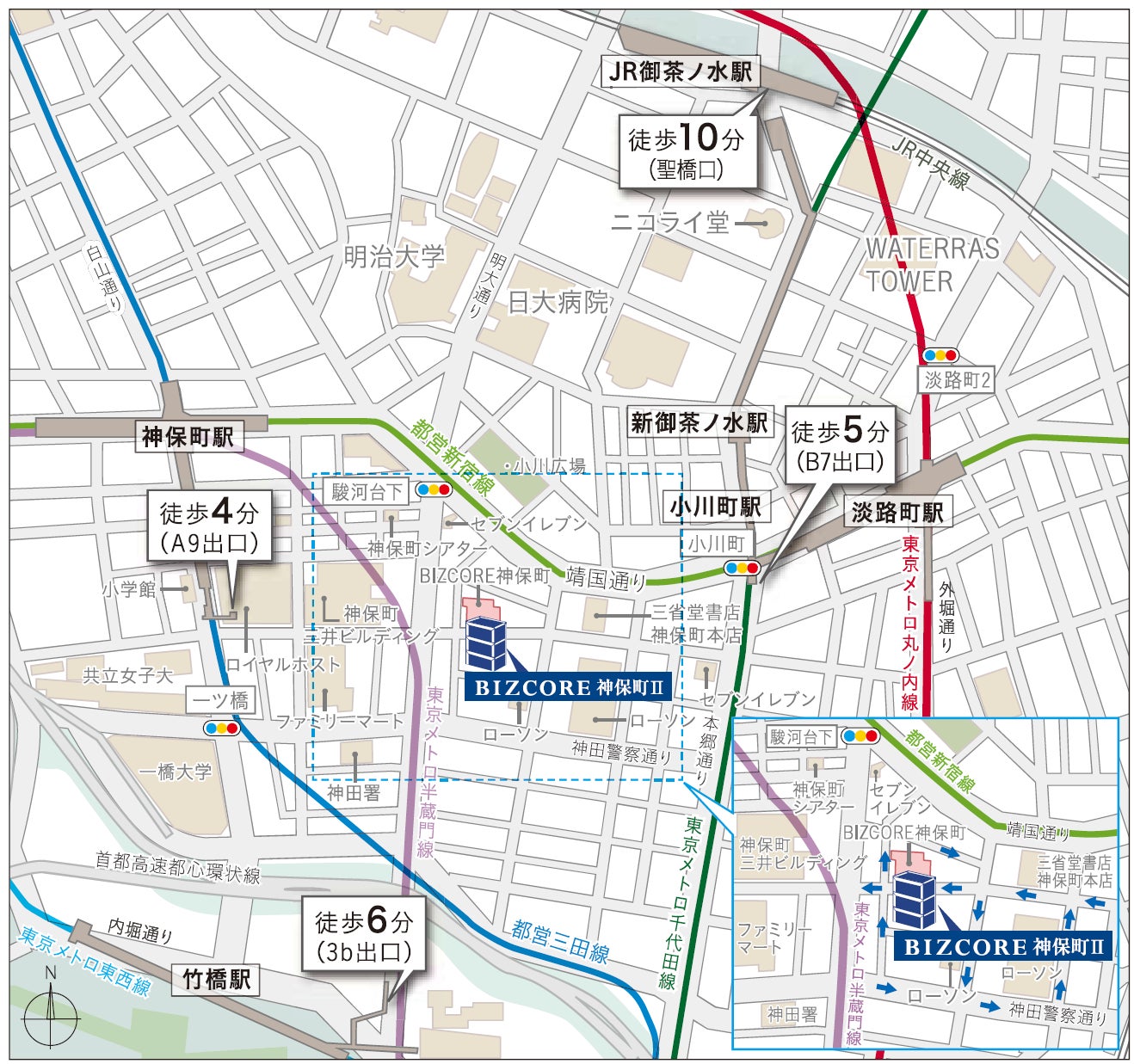 ・徒歩5分以内に、「神保町」駅、「小川町」駅、「淡路町」駅、「新御茶ノ水」駅、4駅5路線の利用が可能なマルチアクセスで交通利便性の高い立地です。