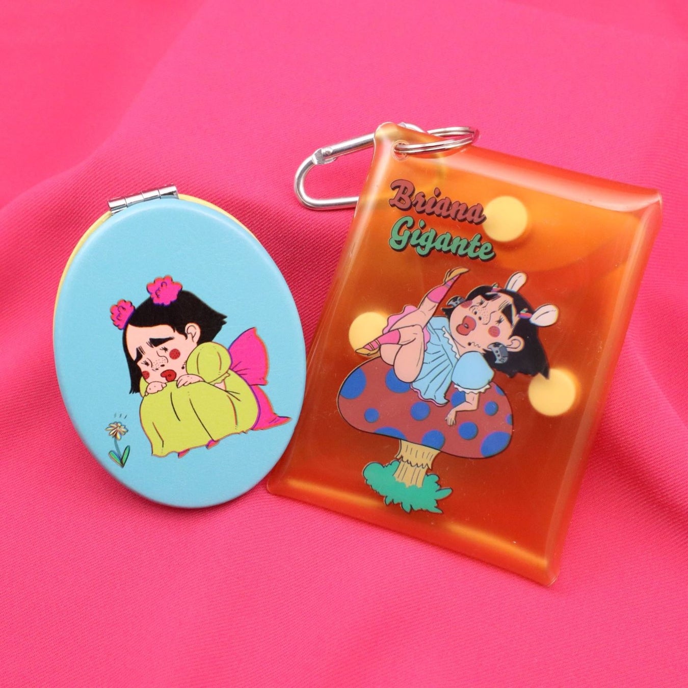 ブリちゃんがお花を見つめるバイカラーのコンパクトミラーと、キノコの上で踊るハッピーなデザインのクリアマルチケース。