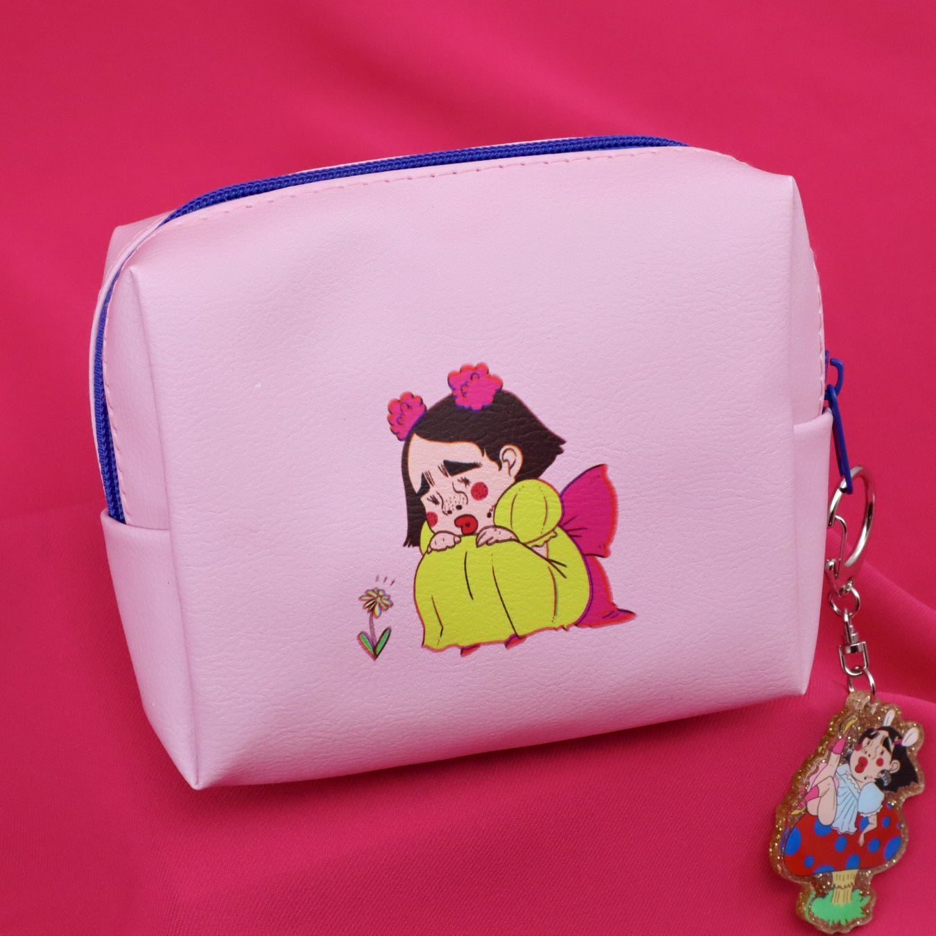 合皮素材で自立するマチタイプのスクエアポーチ。裏面のお花を見つめる乙女なデザインもキュートです。