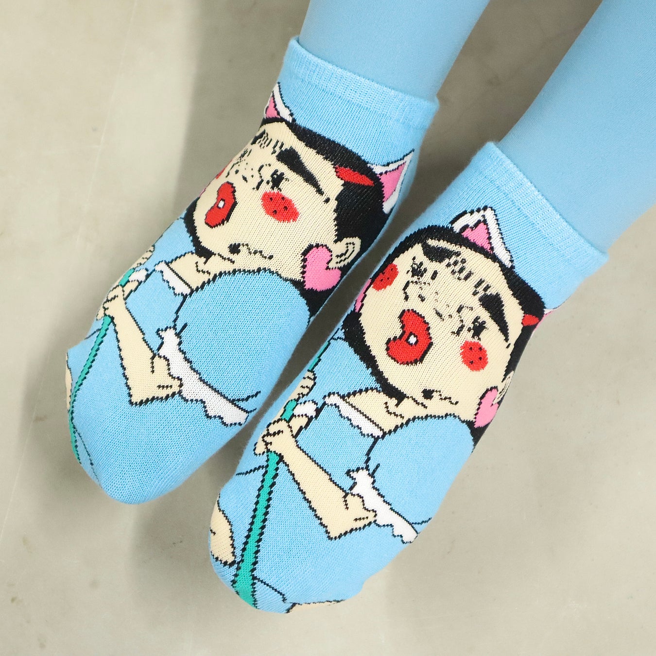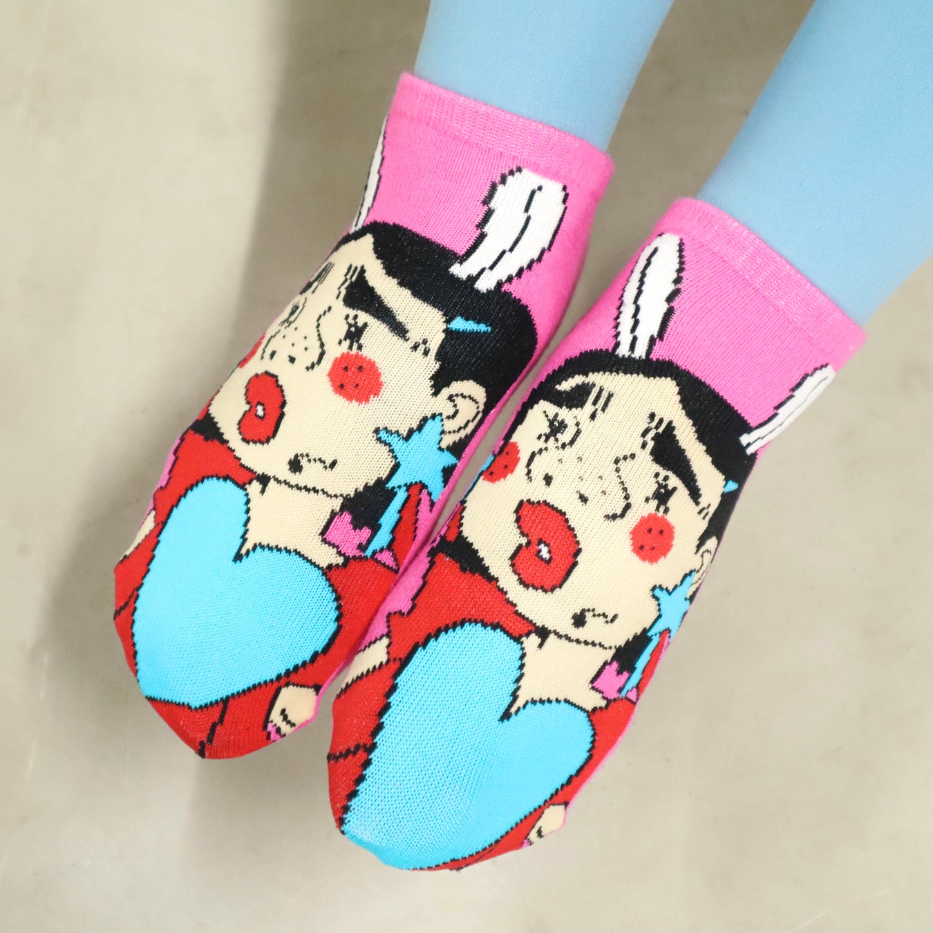 ローズピンクとスカイブルーのコントラストが印象的なソックス。カラー毎に猫耳とうさ耳を付けたブリちゃんがキュートなデザインです。