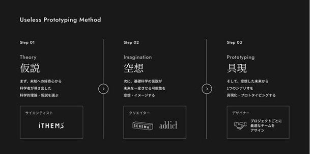 本プロジェクトでは、「Useless Prototyping Method(ユースレス・プロトタイピング・メソッド)」という、下記の3つのステップに基づく独自メソッドを活用して、科学的理論・仮説が持つ未来へのポテンシャルを可視化していきます。