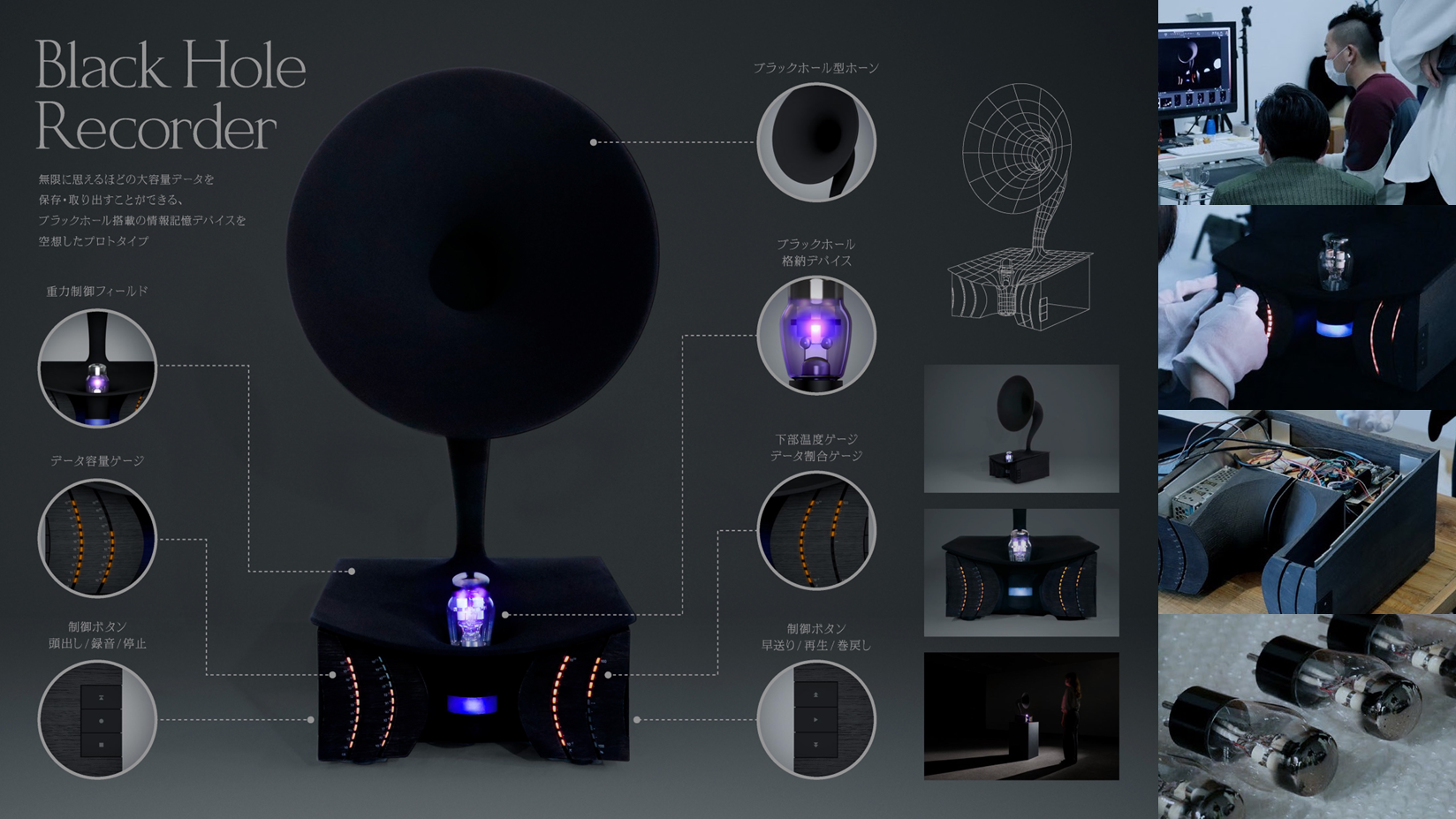 「Black Hole Recorder」は、ブラックホールを制御し、情報を蓄積できるデバイスとして利用する未来を見据えて開発された、ブラックホールストレージのプロトタイプ(模型)です。蓄音機をモチーフに、膨大なデータを録音することができるデバイスという設定です。また大容量の情報を蓄えるだけでなく、取り込んだ情報を取り出すことも可能です。人間は、数千年前に文字を発明して以降、情報を記録する媒体と技術を紙・印刷・写真・蓄音機・映像・データと進化させてきました。近年、どれだけ大量の情報を蓄えられるかの開発がされています。そして将来、ブラックホールを情報ストレージとして活用し、ポケットに入れて持ち運ぶ時代の可能性が考えられます。