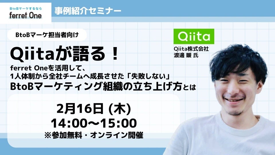 BtoBマーケティングのお困りごとをまるっと解決するサービス『ferret One(フェレットワン)』を運営する株式会社ベーシック(本社:東京都千代田区、代表取締役:秋山勝)は2/16(木)14時より、BtoBマーケティング担当者に向けたイベント「Qiitaが語る!ferret Oneを活用して、1人体制から全社チームへ成長させた『失敗しない』BtoBマーケティング組織の立ち上げ方」を開催いたします。