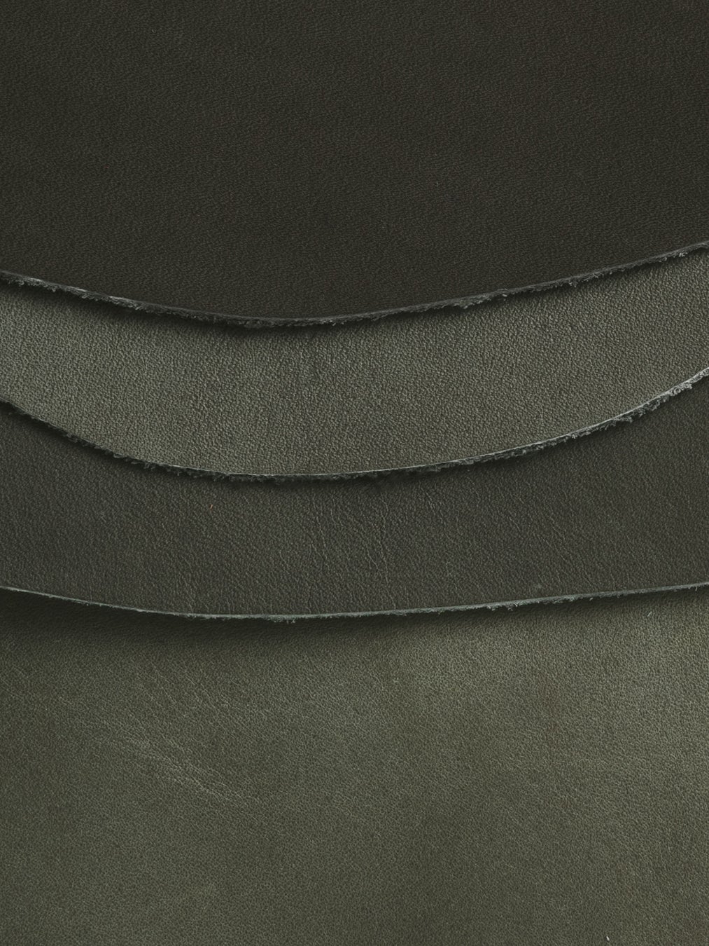 鉄染をした牛革は、クロム鞣しの後にタンニン鞣しを施した牛革を鉄溶液に含侵させ、タンニンと革のタンパク質が鉄分に反応する性質を利用して染め上げた革素材です。黒味を帯びて鈍くくすんだ深緑に青や茶色のニュアンスも含んだ独特の深みがある豊かな色合いを、最後に染料で調色して仕上げました。