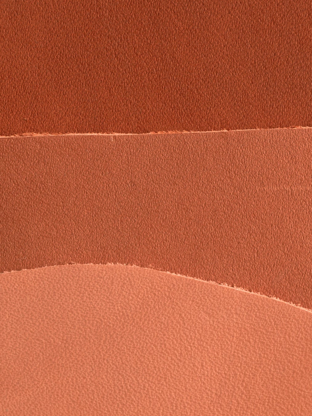 弁柄染をした牛革は、クロム鞣しの後にタンニン鞣しを施した牛革を、赤色の第二酸化鉄の溶液で染色した特殊な革です。弁柄染ならではの奥行きのある優しい赤色を表出し、最後に染料で調色して仕上げます。今回の弁柄染は、2025年に創業60周年を迎える当社にとって、干支が一巡したお祝いにも通ずる色と捉えています。