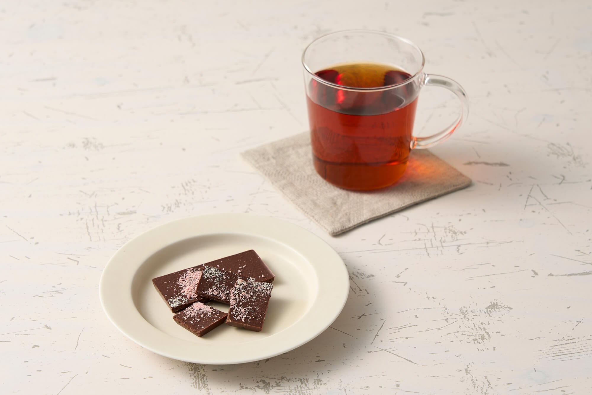 土台となるのは、赤いベリーのような爽やかな酸味が特徴のマダガスカル産カカオ。ローズオイルの優雅な香りを引き立てるため「細挽き」製法を採用しました。酸味の角を落とし、砂糖の種類まで吟味することで、カカオの果実感とバラの香りが完璧なハーモニーを奏でる仕立てにこだわりました。