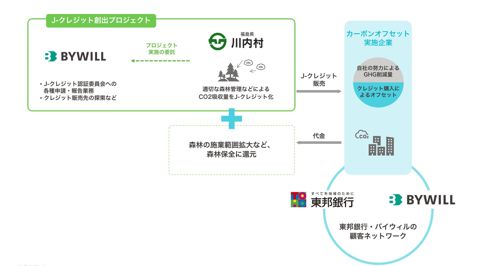 バイウィルは、川内村におけるJ-クレジット創出プロジェクトの登録・申請からモニタリング、創出したクレジットの販売までをシームレスに支援します。また、販売に関しては、東邦銀行とも協力し、「地産地消」によって川内村をはじめとする地域の脱炭素化を促進します。