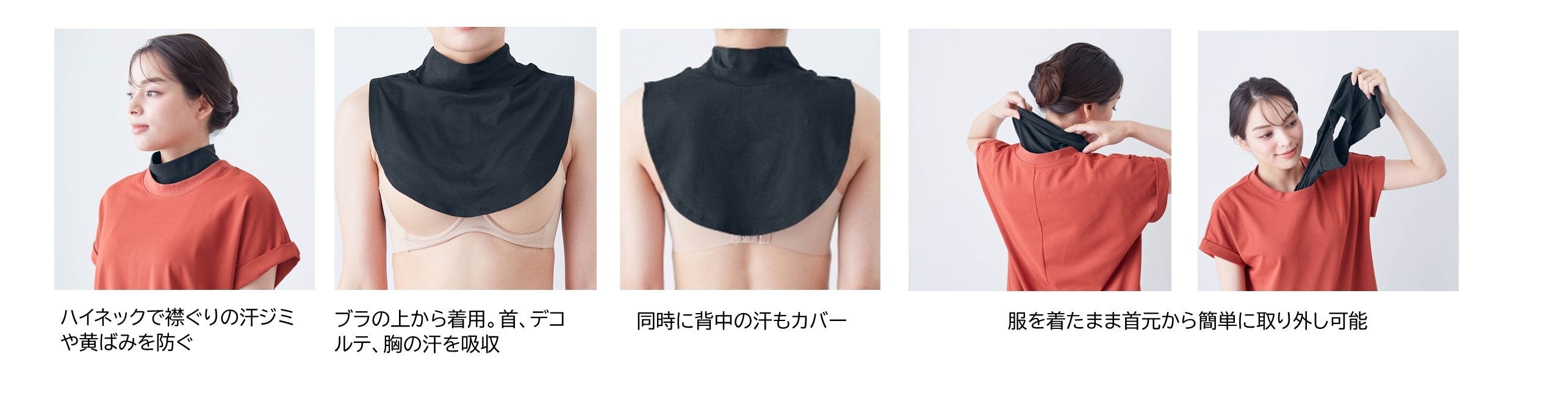 2025年のシリーズ化以降、「汗を吸収してくれる」「汗をかいたらすぐ外せて楽」といった声が寄せられている「脱げるんジャー」シリーズからは、「脇背中」「背中」「胸」用の商品に加わる新商品として、襟ぐりの汗ジミや黄ばみを防ぐ「首用タイプ」が登場します。「脱げるんジャー」は、汗を吸い取ったあと、服を着たまま簡単に取り外しができる機能性インナーで、通勤時や炎天下で汗をかいた際に服を着たまま素早く取り外すことができ、着替えたような爽快感があります。新たに「首用タイプ」を拡充することで、身体の部位によって異なる汗の悩みの解消を実現します。