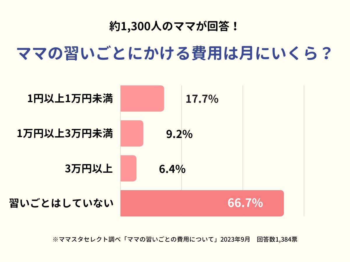 「ママの習いごとにかける費用は月々いくらですか?」という設問に対し、「1円以上1万円未満」「1万円以上3万円未満」「3万円以上」「習いごとはしていない」の4つの選択肢を設定。1,300人を超えるママたちから回答が集まりました。