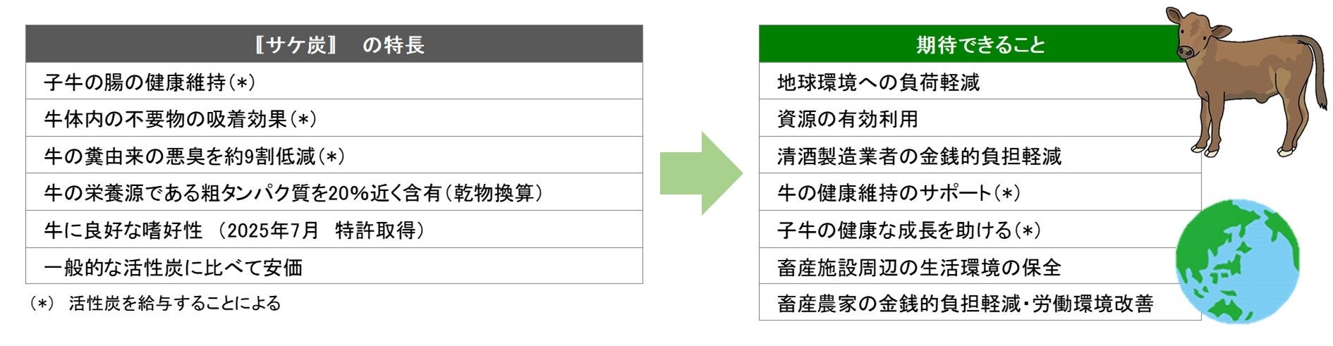 「サケ炭」は、安価で栄養価が高く、子牛の健康な成長を助けることができ(*)、さらに、糞由来の悪臭を抑える(*)ことができます。また、全国の清酒製造業から発生し産業廃棄物となっていた処理後活性炭を、有効な資源として利用することができます。これらにより、清酒製造業者および畜産農家の負担と環境負荷を低減することが可能と考えます。