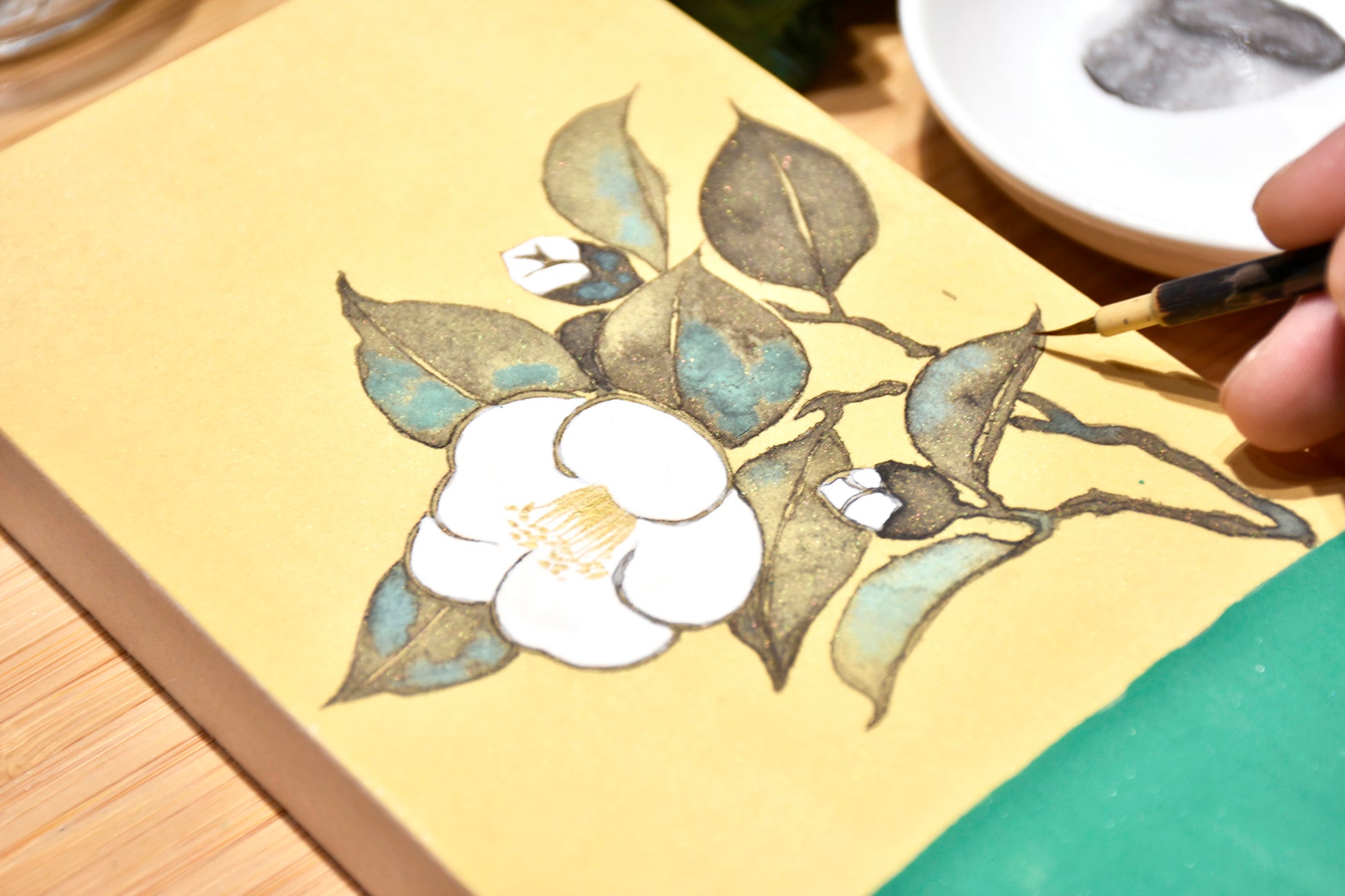 金泥と岩絵具を使って花の作品を制作いたします。日本では、職人たちの高い技術に支えられながら金属製の絵具や天然岩絵具を用いた数多くの美術作品が生まれました。そうした極東における多様な表現のうち、「金泥」と「たらし込み」の技法をご体験いただきます。いずれも難しいことはありません。墨、金、緑青それぞれの輝きを感じてください。(日英同時通訳あり)