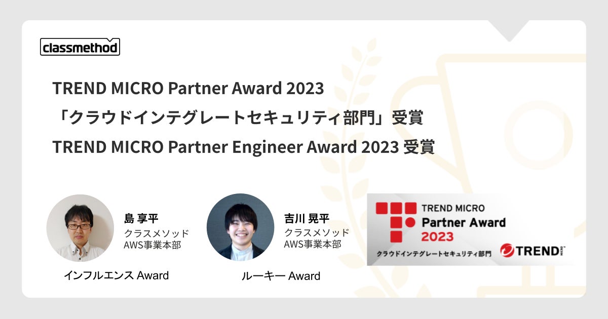 クラスメソッド株式会社(本社:東京都港区、代表取締役:横田 聡、以下「クラスメソッド」)は、サイバーセキュリティ製品やソリューションを開発・提供するトレンドマイクロ株式会社(本社:東京都新宿区、代表取締役社長 兼 CEO:エバ・チェン、以下「トレンドマイクロ」)が2024年7月23日(火)に開催した「Risk to Resilience World Tour」にて、TREND MICRO Partner Award 2023「クラウドインテグレートセキュリティ部門」アワードを受賞しました。また、「TREND MICRO Partner Engineer Award 2023」を島 享平と吉川 晃平の2名が受賞しました。