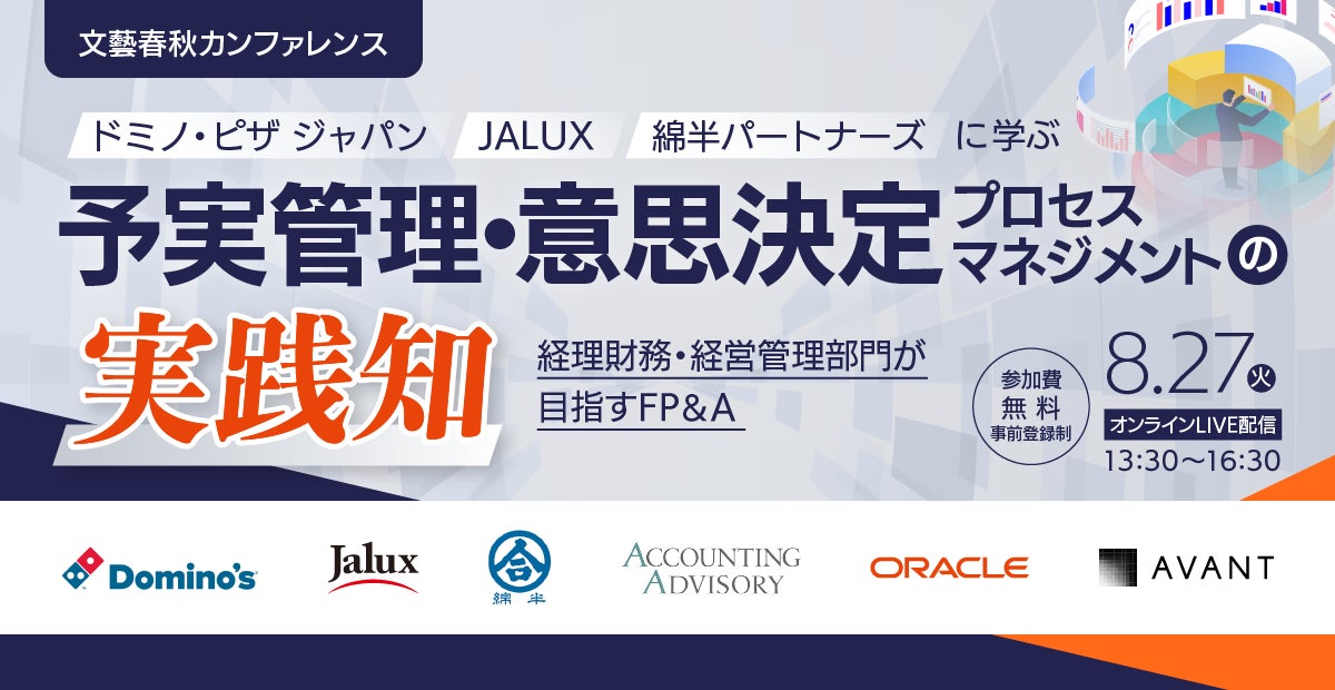 アバントグループでグループ経営管理・連結会計・事業管理のソリューションを提供する株式会社アバント(本社:東京都港区、代表取締役社長 執行役員 CEO:岡部 貴弘、以下 アバント)は、2024年8月27日に開催される株式会社文藝春秋(本社:東京都千代田区、代表取締役:飯窪 成幸、以下 文藝春秋)主催ビジネスカンファレンス「ドミノ・ピザ ジャパン、JALUX、綿半パートナーズに学ぶ予実管理・意思決定プロセスマネジメントの実践知~経理財務・経営管理部門が目指すFP&A~」へ協賛ならびに登壇をいたします。