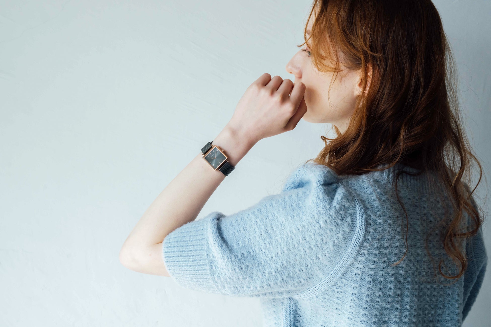 シャープな印象を与えるスクエアケース、バーインデックス、針の組み合わせが洗練された腕元を演出します。