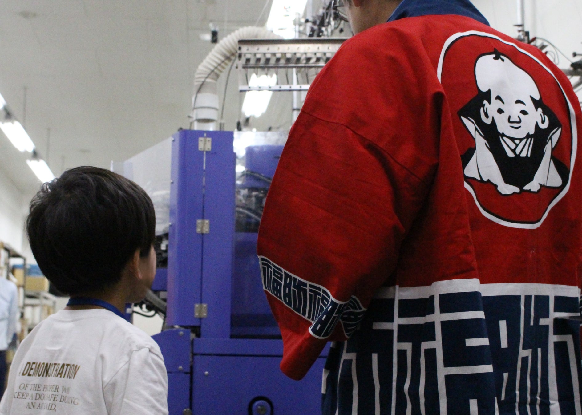 概 要 :『HANKYU こどもカレッジ』を通し選ばれた2名の小学生に向けて、阪急百貨店様より百貨店バイヤーのお仕事についてのご説明。その後、福助からは当社や靴下に関する説明、「ねむり糸」についての解説などを行い、こども達には靴下のデザインを行っていただきました。何度も絵を描きなおし、ベースやモチーフの色を考え、試行錯誤の上完成したデザインの後はこども達に品質検査の工程をご覧いただきました。そして、今回ご自身がデザインした靴下の編み立てを目の前で見学。特別にお子さまサイズでつくった靴下はお土産としてお持ち帰りいただきました。