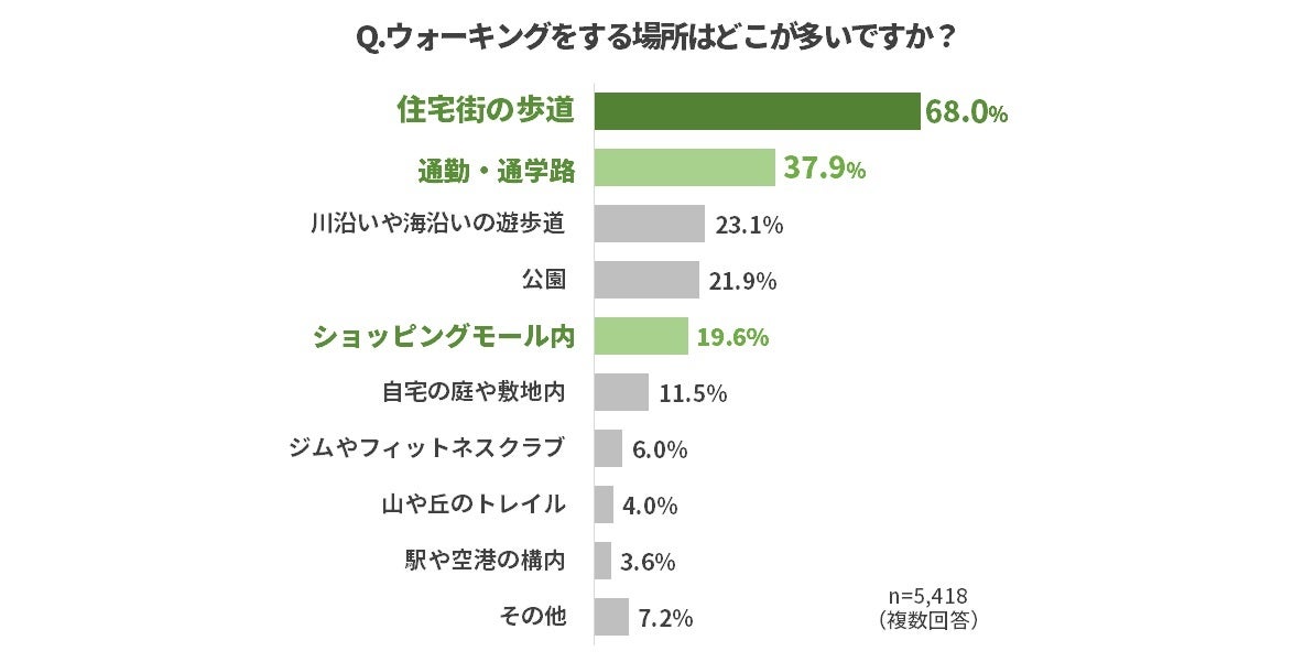 ■ウォーキングは自宅周りの住宅街、通勤時に一駅前で降りる人も。ショッピングモール内も2割