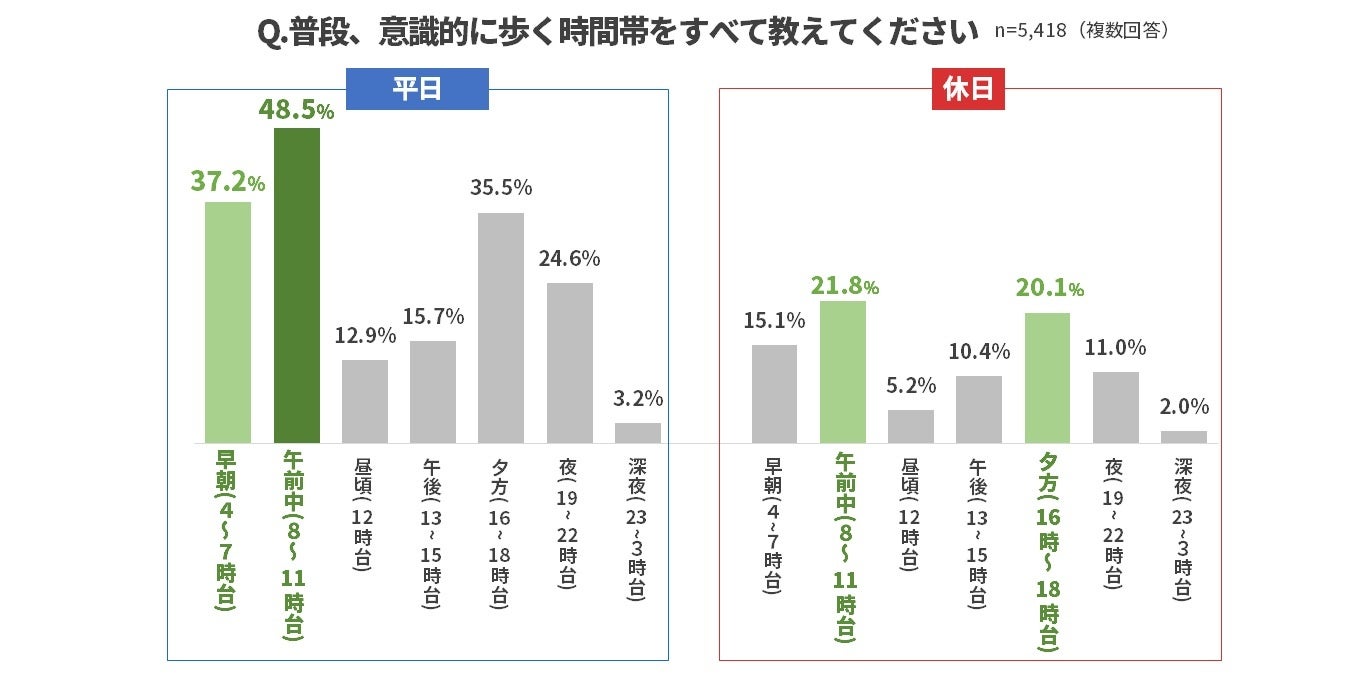 時間の詳細を見てみると、トップは「平日・午前中(8~11時台)」(48.5%)でした。「平日・早朝(4~7時台)」(37.2%)という人も多く、早い時間帯を選んで歩く方が多いようです。