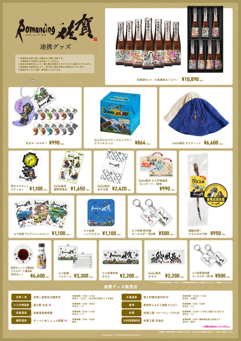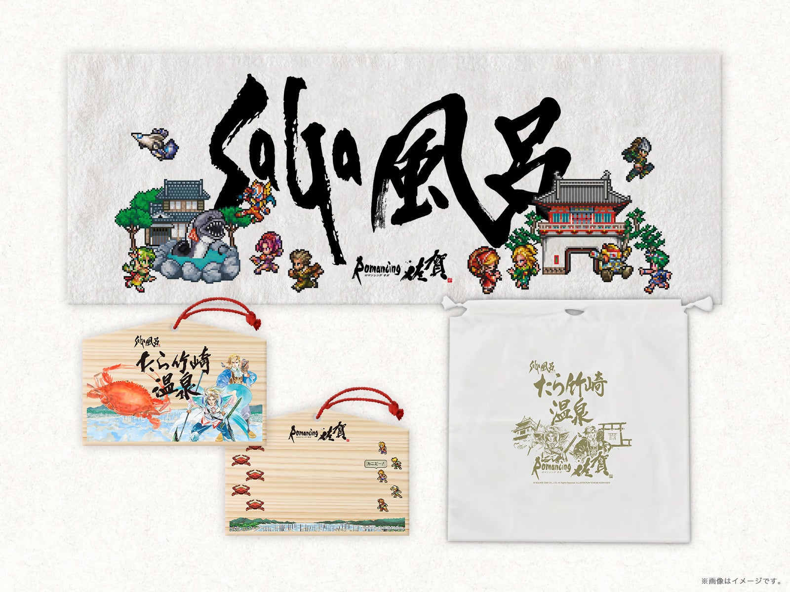 佐賀酒セットやSaGa風呂グッズなどサガと佐賀がコラボレーションした連携グッズが発売中。ぜひこの機会にお買い求めください。