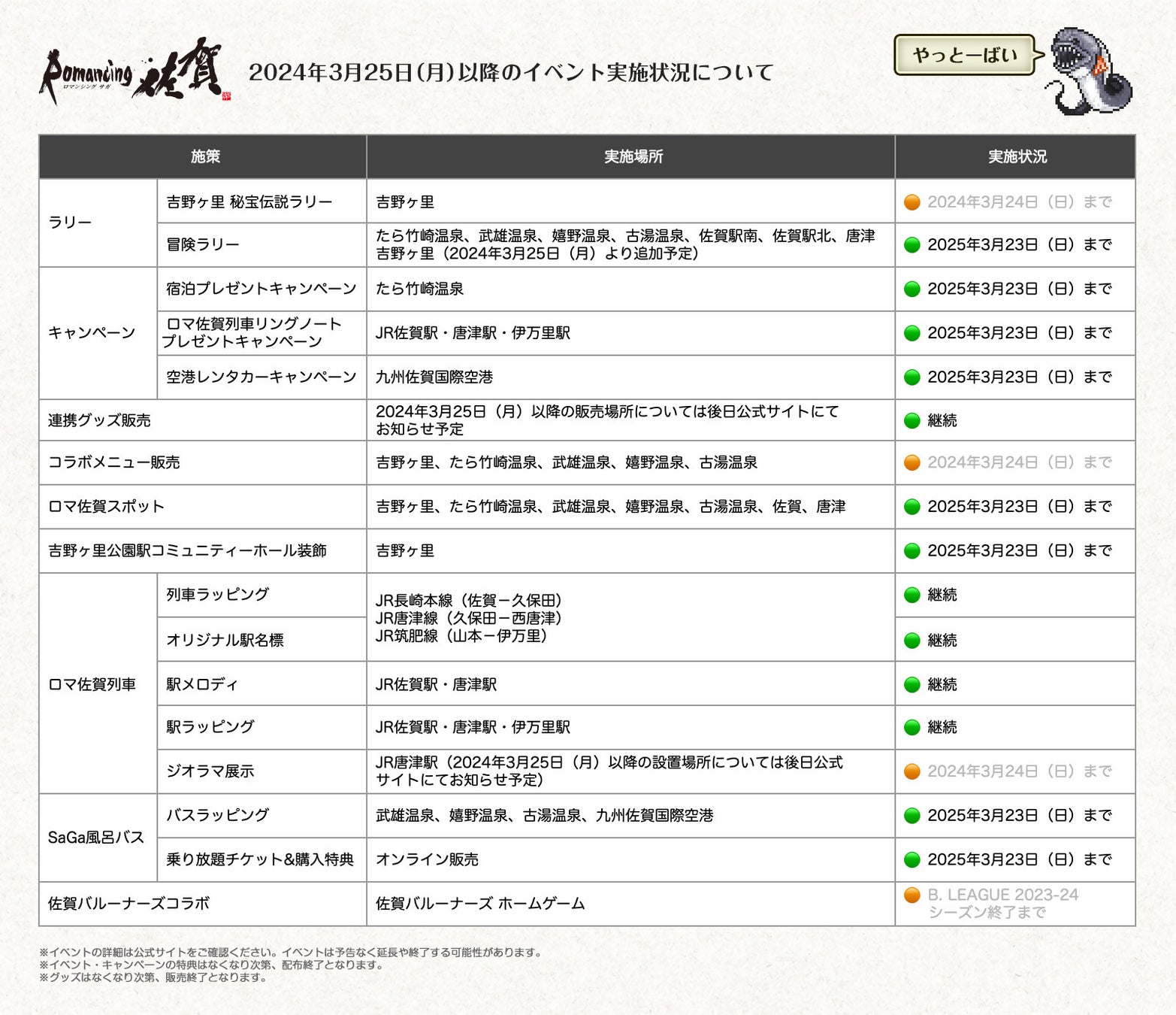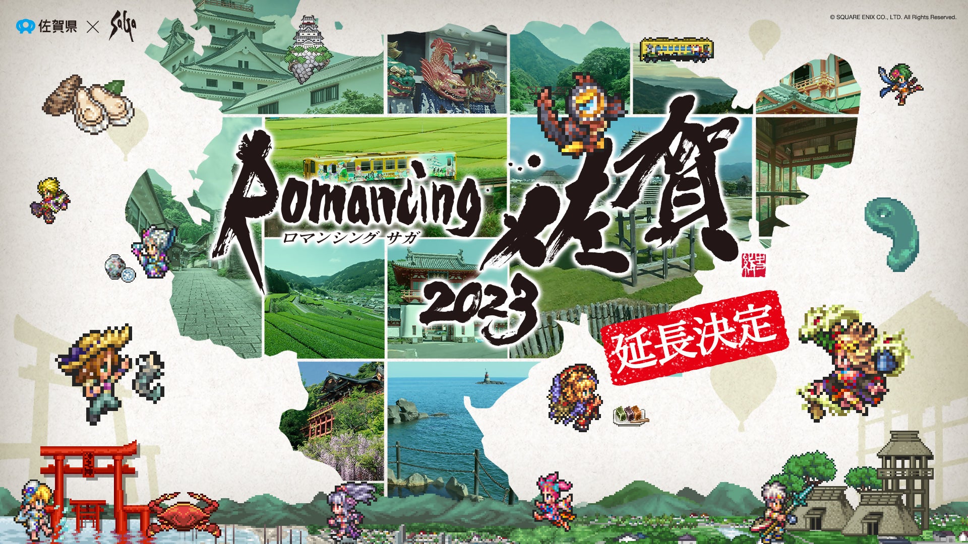 佐賀県は、株式会社スクウェア・エニックスのRPG「サガ」シリーズとのコラボレーション企画「ロマンシング佐賀2023」の佐賀県内での一部のリアルイベントの開催期間を2024年3月24日から、好評につき下記のとおり延長いたします。延長期間は2025年3月23日(日曜日)までを予定しておりますが、予告なく変更や終了する可能性がありますので予めご了承ください。