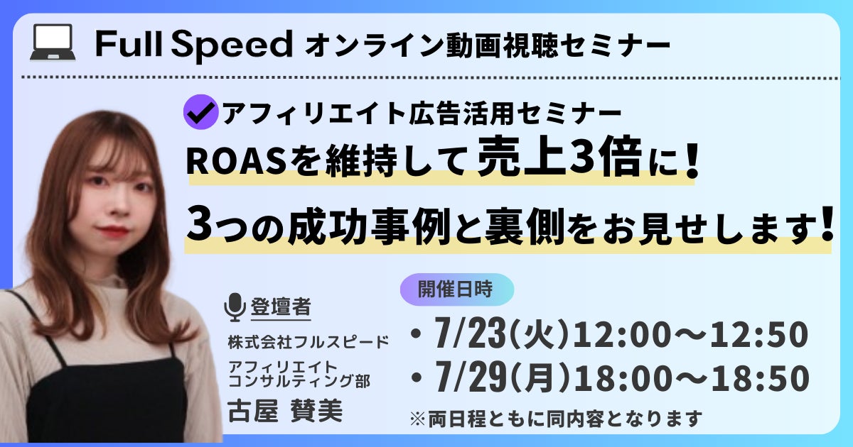 インターネットマーケティング支援を行う株式会社フルスピードは、「アフィリエイト広告活用セミナーROASを維持し売上3倍に! 3つの成功事例と裏側をお見せします!」と題したオンライン動画視聴セミナーを全2日程で開催いたします。