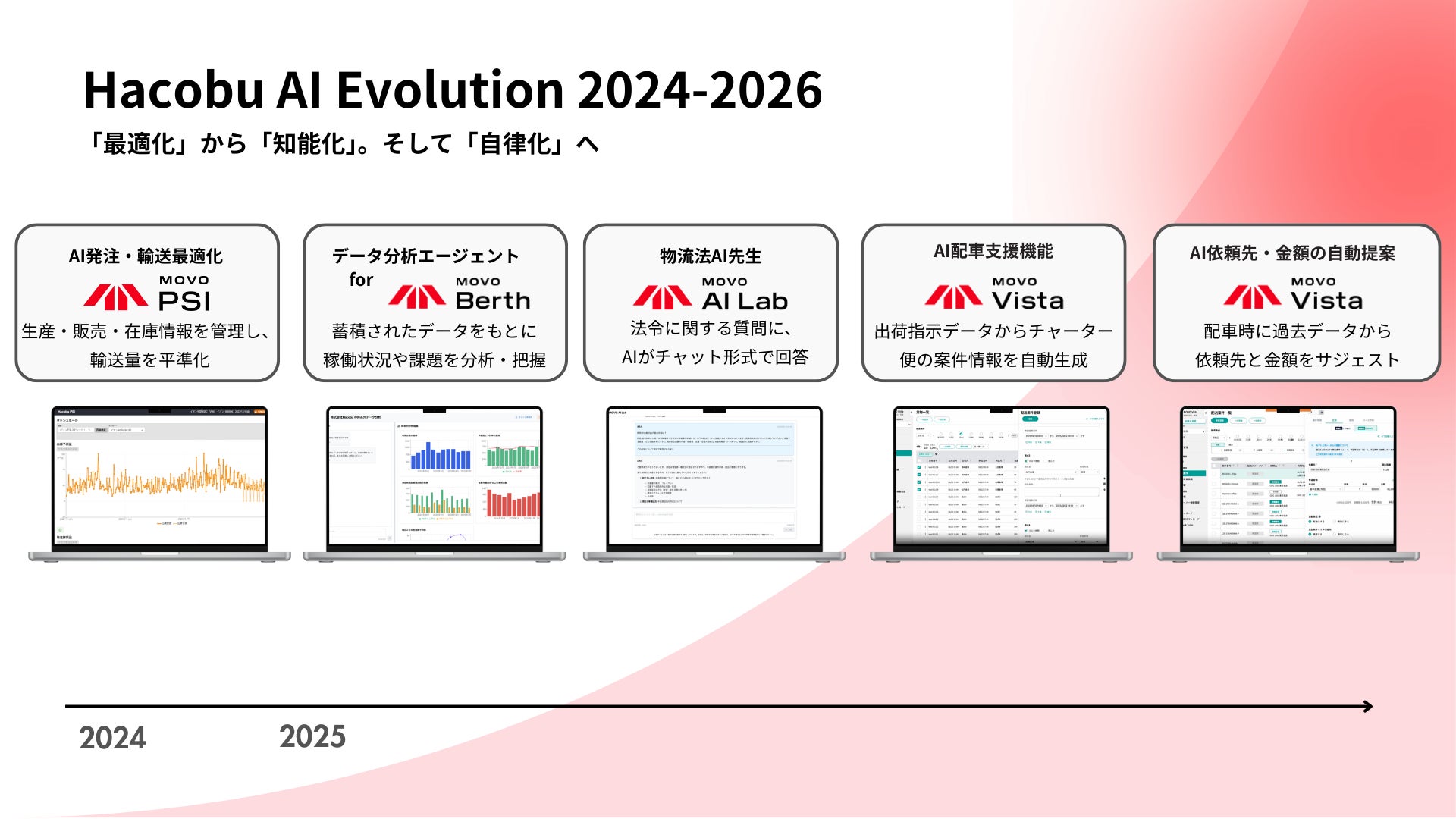 クラウド物流管理ソリューション「MOVO(ムーボ)」シリーズと、物流DXコンサルティング「Hacobu Strategy(ハコブ・ストラテジー)」、システムインテグレーション・AI導入支援「Hacobu Solution Studio(ハコブ・ソリューションスタジオ)」を展開。6年連続シェアNo.1(※1)のトラック予約受付サービス「MOVO Berth」、動態管理サービス「MOVO Fleet」、配車受発注・管理サービス「MOVO Vista」、AI発注・輸送最適化サービス「MOVO PSI」などのクラウドサービス、ドライバーの働き方を変えるスマホアプリ「MOVO Driver」の提供に加え、物流DXパートナーとして企業間物流の最適化を支援しています。https://hacobu.jp/