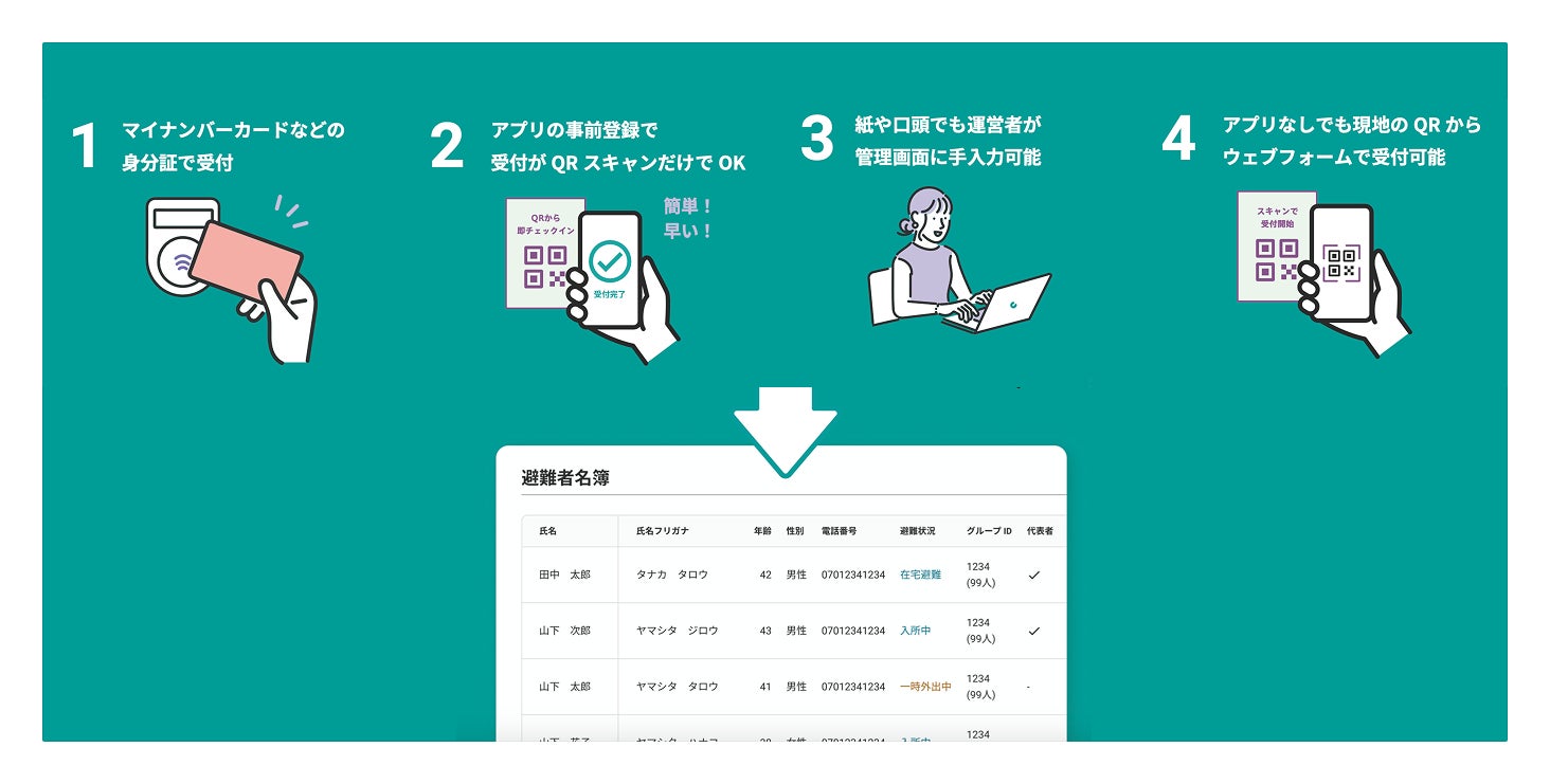 マイナンバーカード等の身分証の読み取り、アプリやWEBフォームを用いたスマートフォンによる情報登録、また職員による管理画面への手動入力による入所手続きが可能で、あらゆる避難者に対応していただけます。