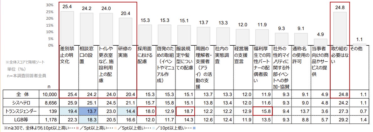 『差別禁止の明文化、相談窓口の設置、トイレや更衣室など施設利用上の配慮、研修の実施』が 2割を超え上位。しかしながらそれと同等の割合で、「取り組む必要はない」との回答もあった。