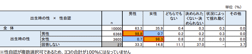 出生時の性と性自認が一致すると回答したのは、男性で98.8%、女性で98.3%。