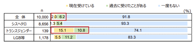 なかでも、トランスジェンダーは15.1%が現在も職場でSOGIハラを受けていると回答しており、被害率が高い。