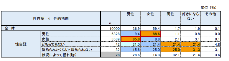 性自認が男性で恋愛対象が女性と回答したのは88.6% 性自認が女性で恋愛対象が男性と回答したのは85.8%。