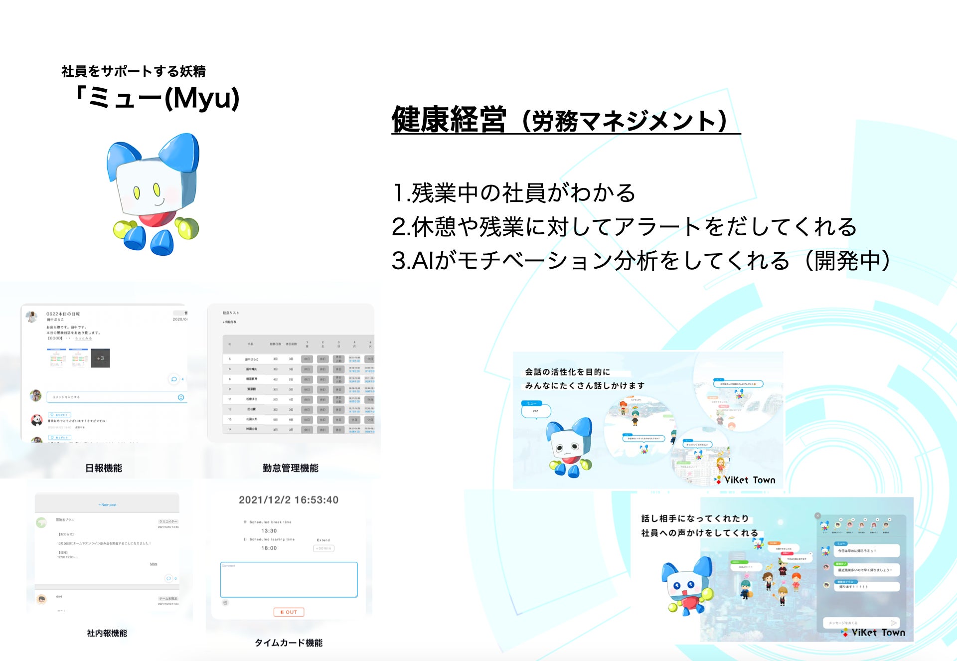 勤怠管理、社内報、日報、TODO管理、残業管理、休憩や残業アラートも含まれています。また、社員をサポートする妖精「ミュー(Myu)」も誕生。「ミュー(Myu)」は、社員同士の会話の活性化・コミュニケーションを促進し、出勤メンバーがいなくなるとおやすみモードに突入。喋り相手がいない時、話し相手になってくれたり、休憩が少なかったり、残業が続いている人へ自動での声掛けや、異世界空間で設定したイベント時に、自動で社員に声掛けをしてくれます。今後はAIを搭載し、異世界空間の住民の会話を覚えながら、様々なコミュニケーションを取ってくれる妖精に成長していきます。リアルなオフィス環境よりも、働く社員の健康管理が充実する機能も存在します。