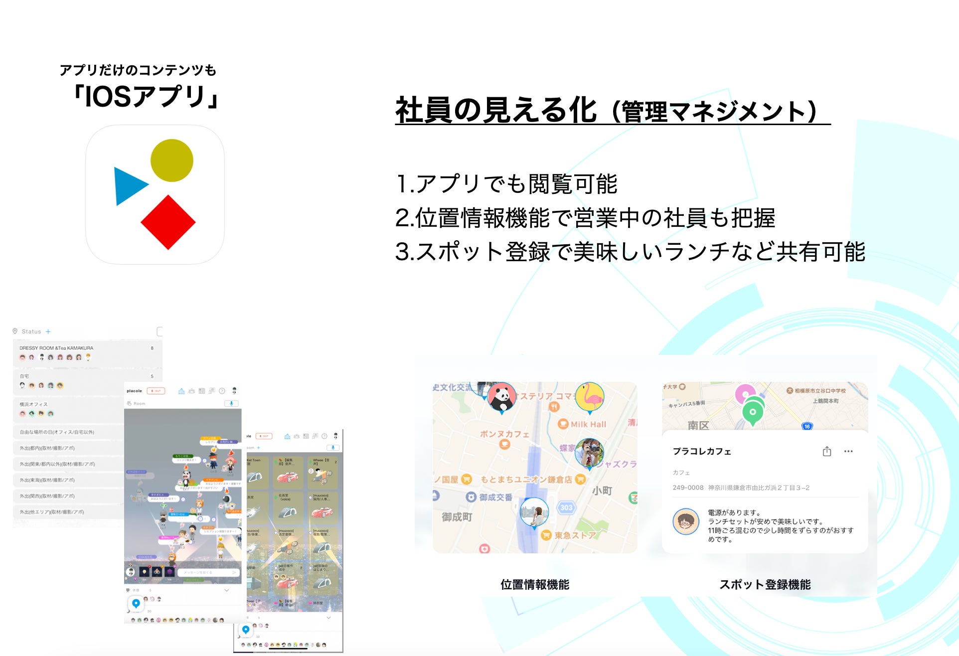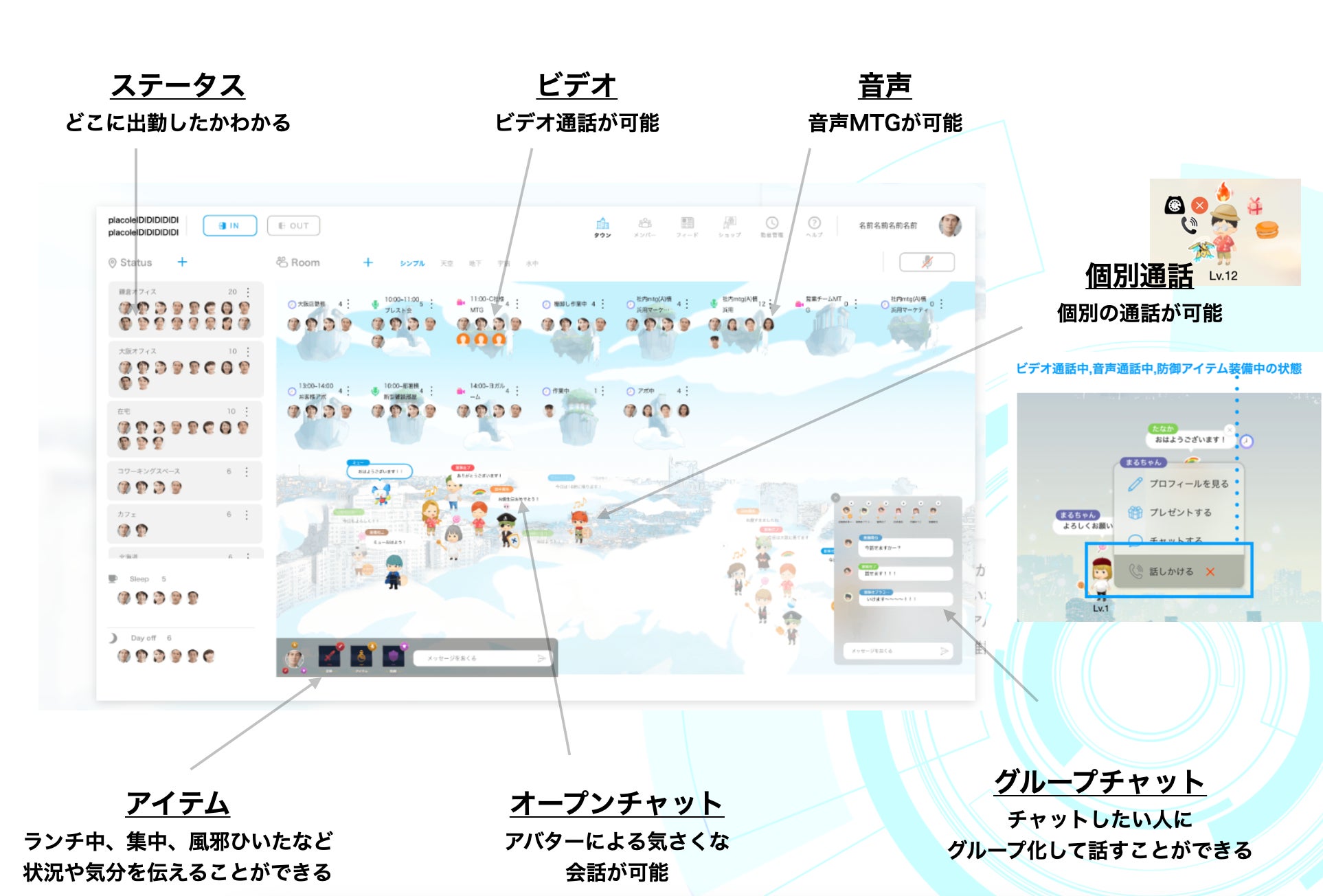 | 1 | 場所からの自由 | アバターチャット機能、ビデオ通話、音声通話、位置情報、スポット登録 |